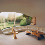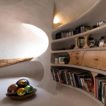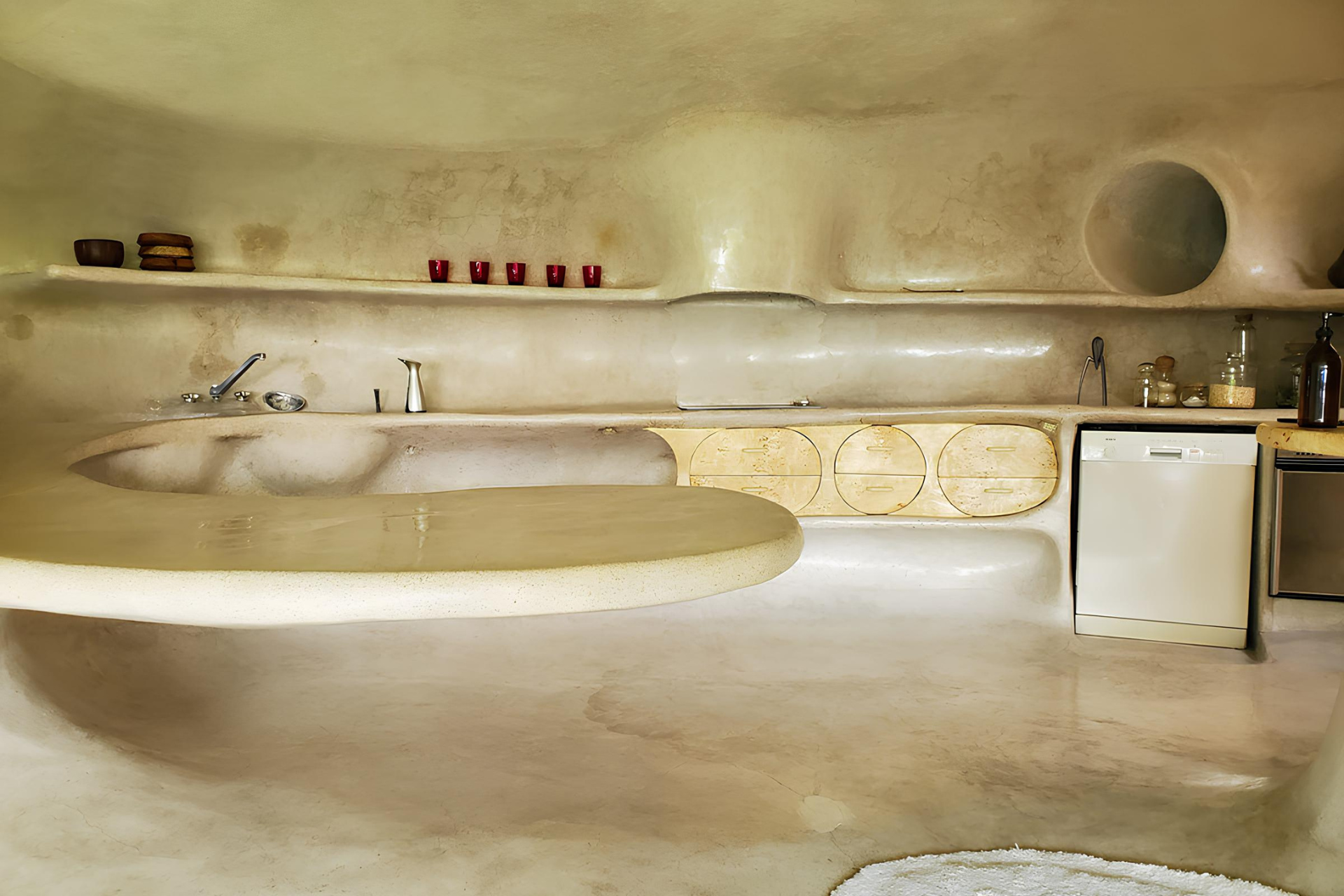 Дом выполнен из ферроцемента — пластичного и прочного материала, который позволил создать плавную, цельную форму. Сверху конструкцию покрывает слой грунта и зелени. Он работает как естественный климат-контроль: летом внутри прохладно, зимой тепло. Растения вокруг защищают от шума и пыли, а обтекаемая форма помогает естественной вентиляции.