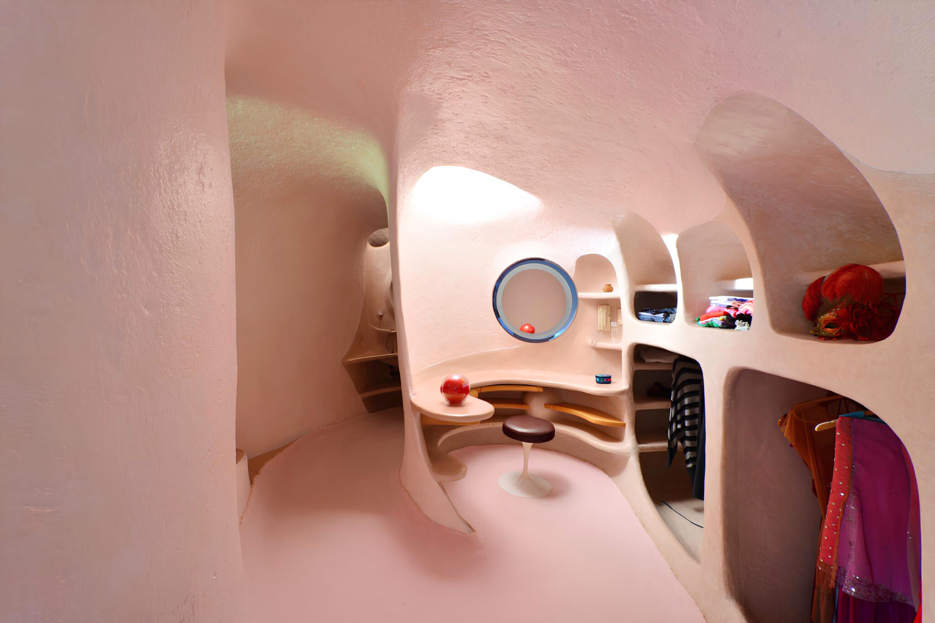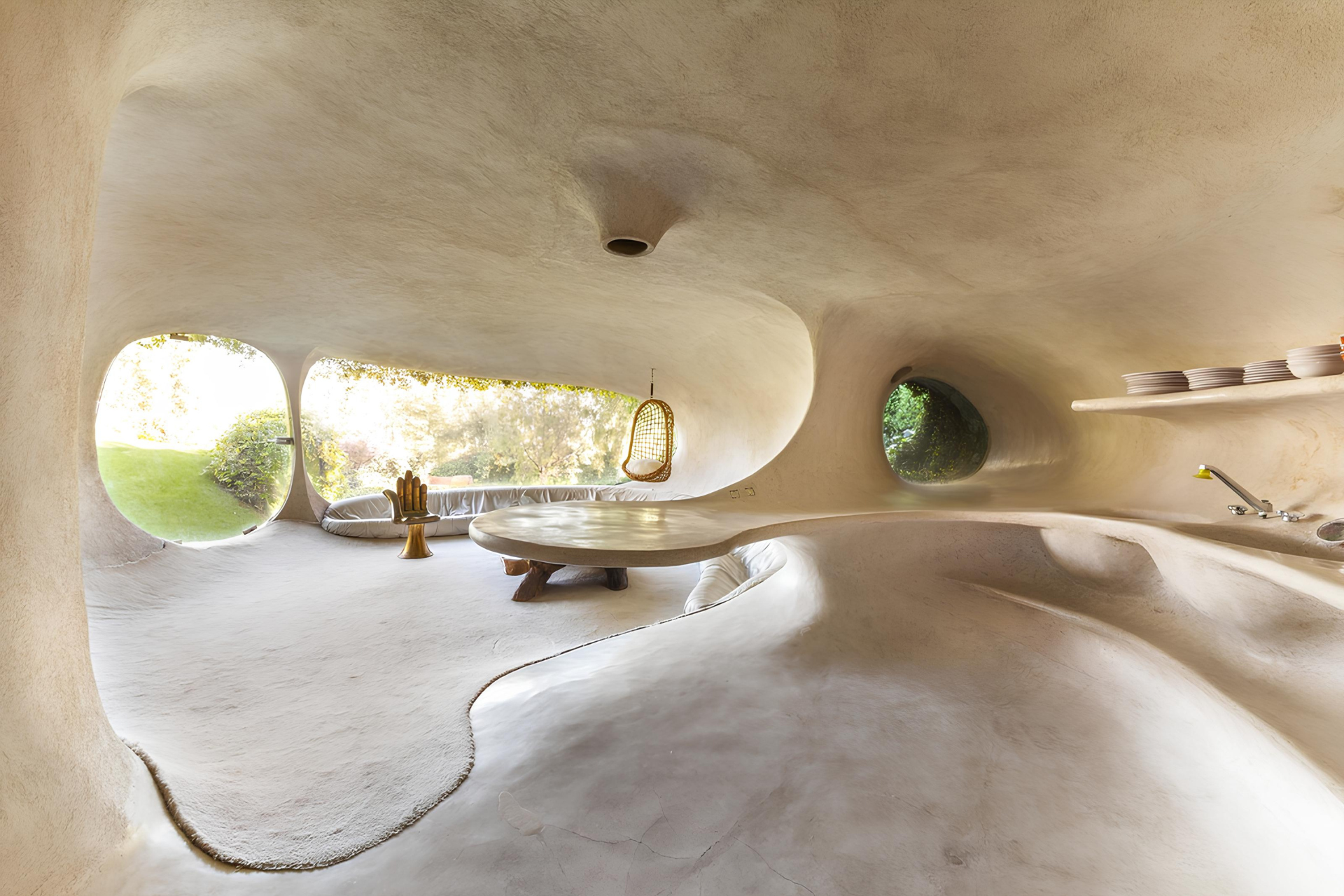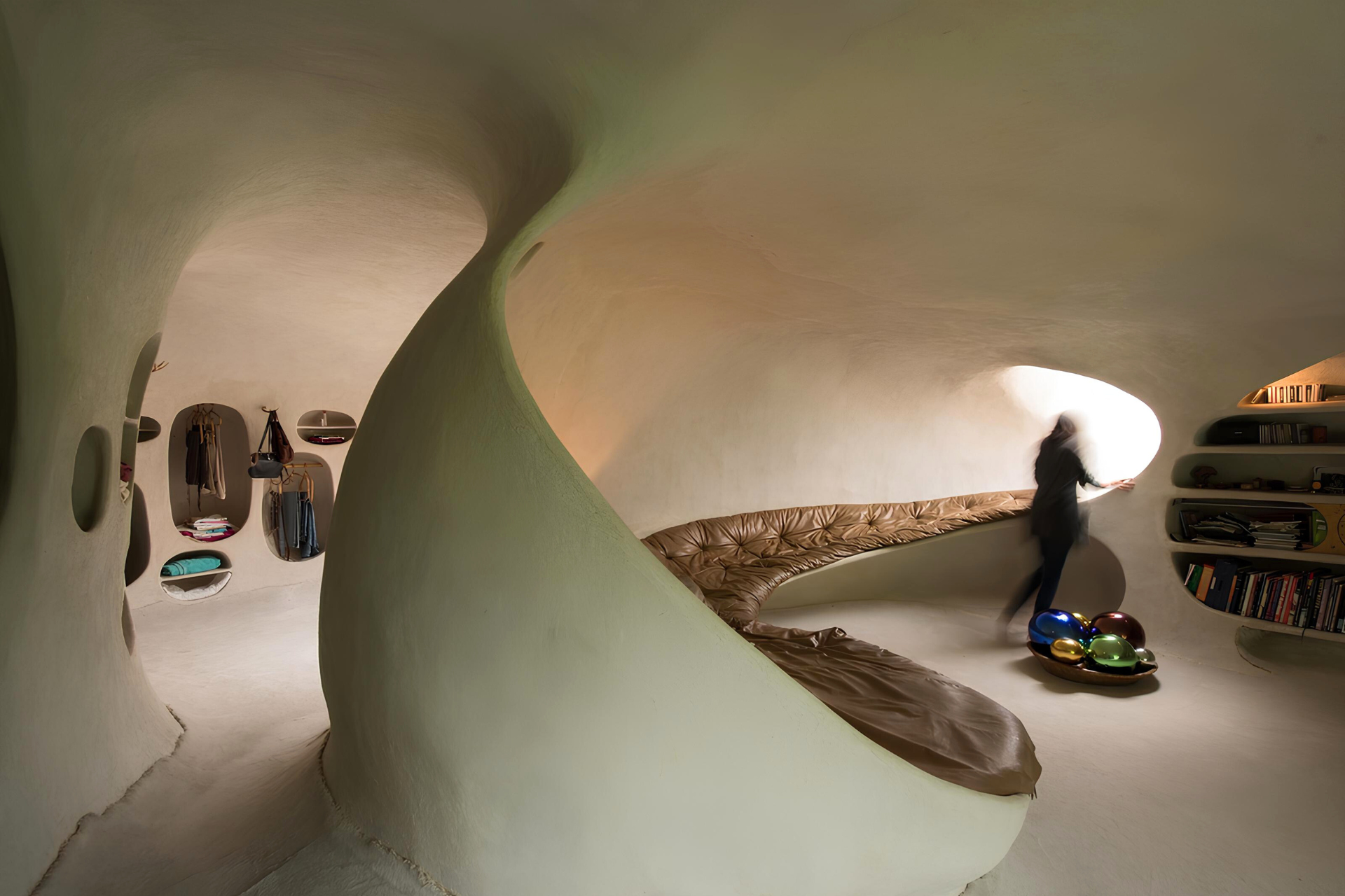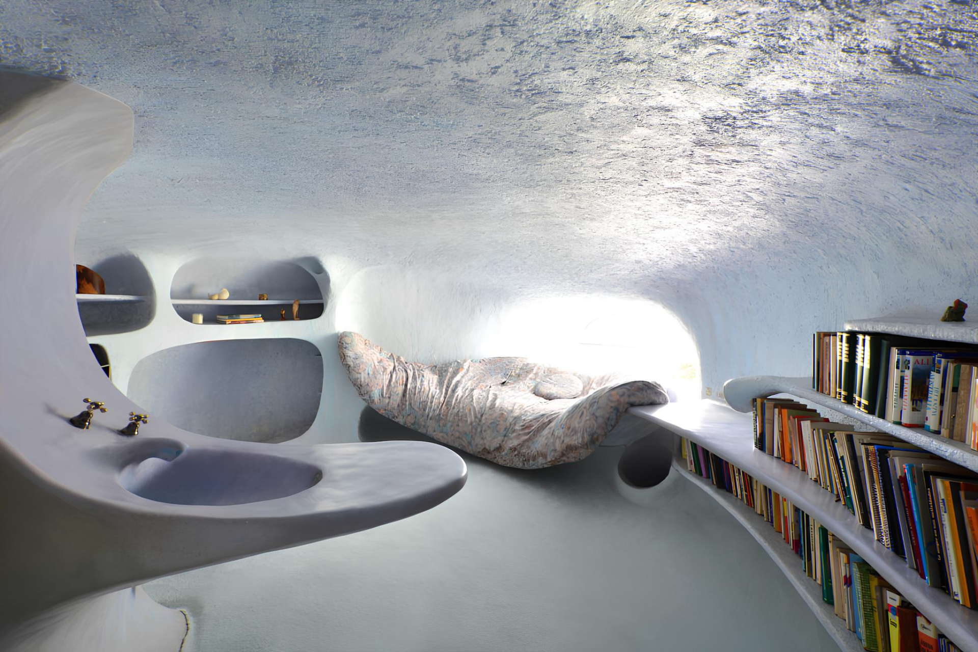 Большая его часть скрыта под землей, а планировка напоминает арахис: два овальных пространства, соединенных коридором. Внутри — полноценное жилье с гостиной, кухней, столовой, спальнями, гардеробной, кабинетом и ванной, но без привычных углов и прямых линий.