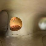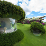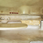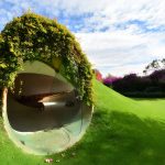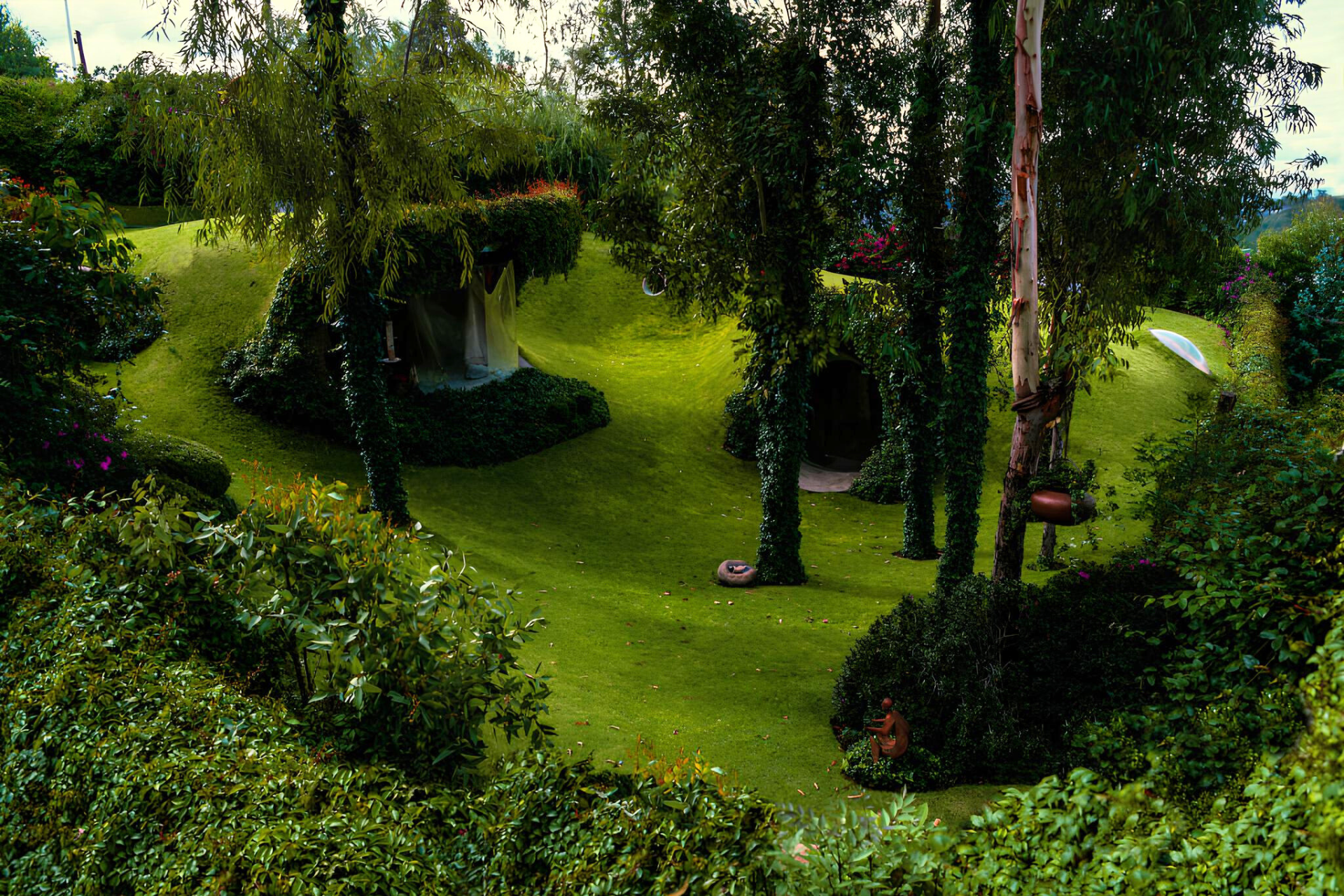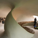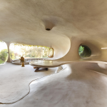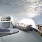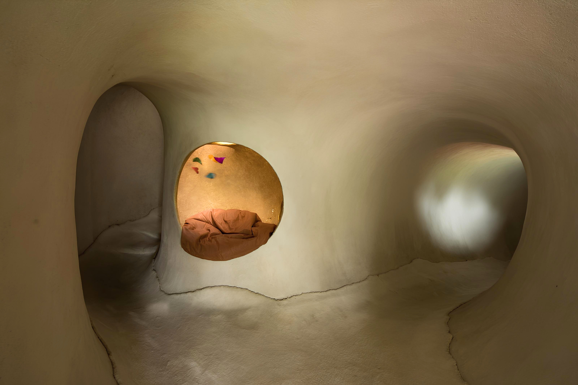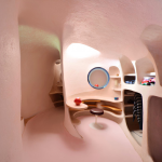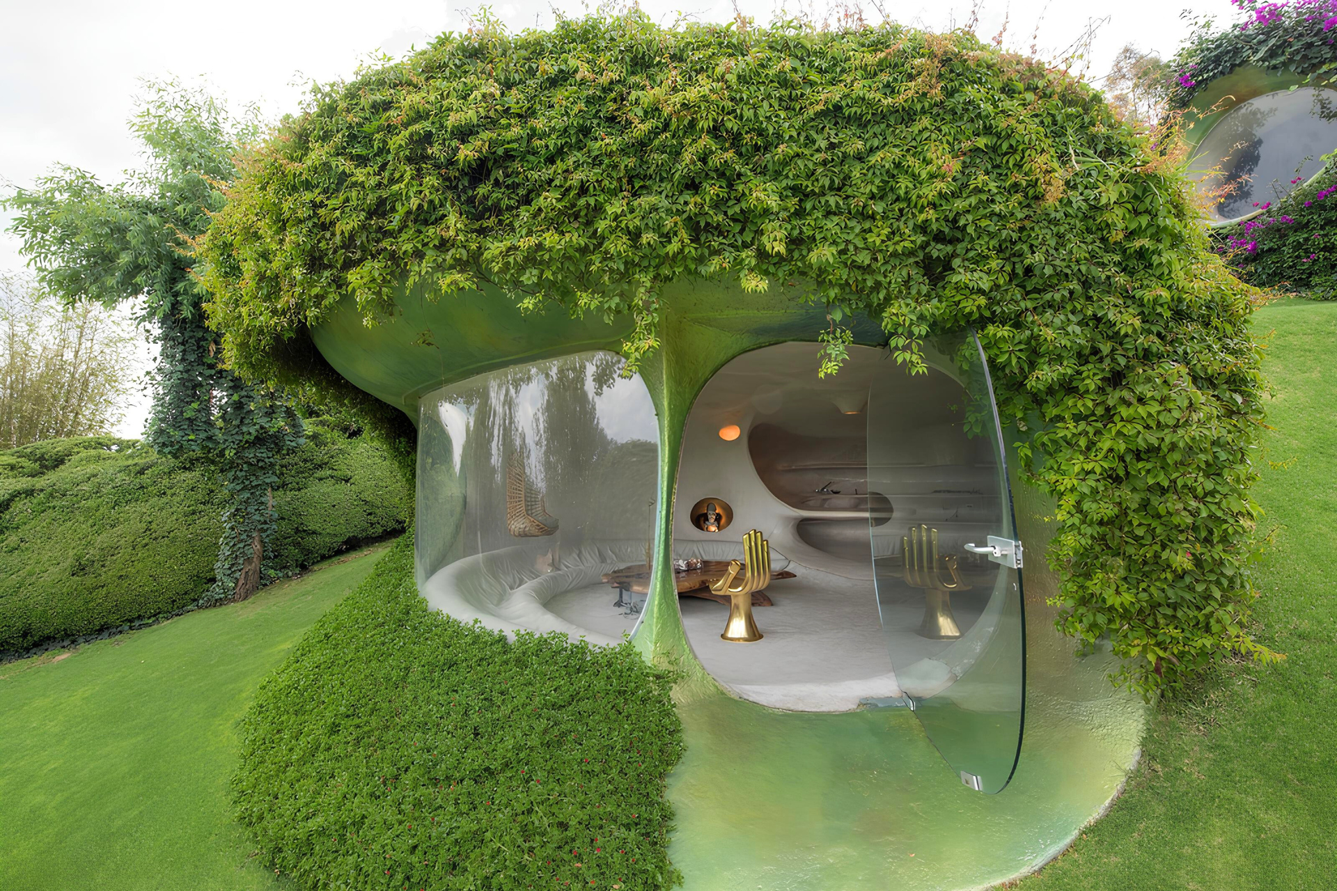 Большая его часть скрыта под землей, а планировка напоминает арахис: два овальных пространства, соединенных коридором. Внутри — полноценное жилье с гостиной, кухней, столовой, спальнями, гардеробной, кабинетом и ванной, но без привычных углов и прямых линий.