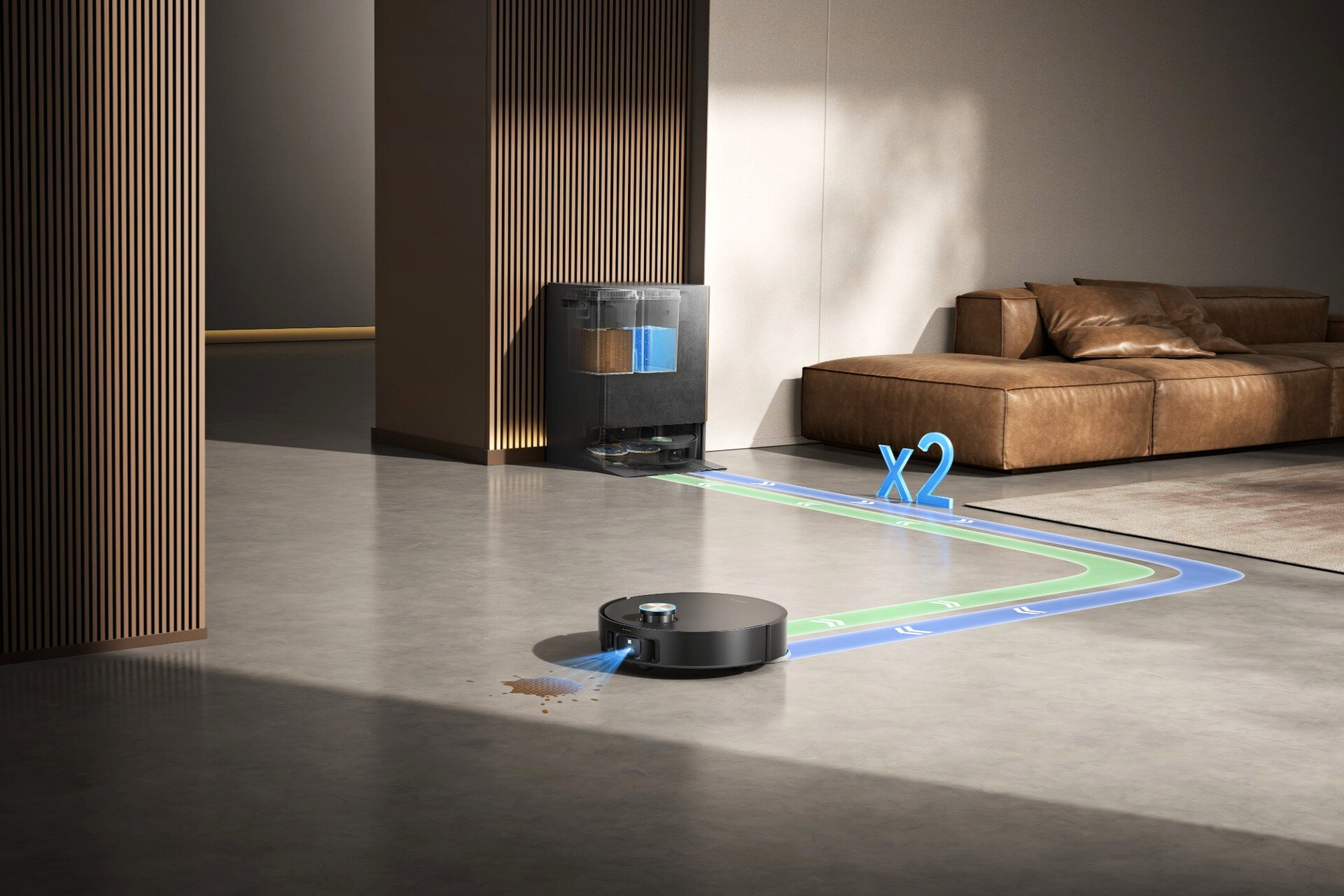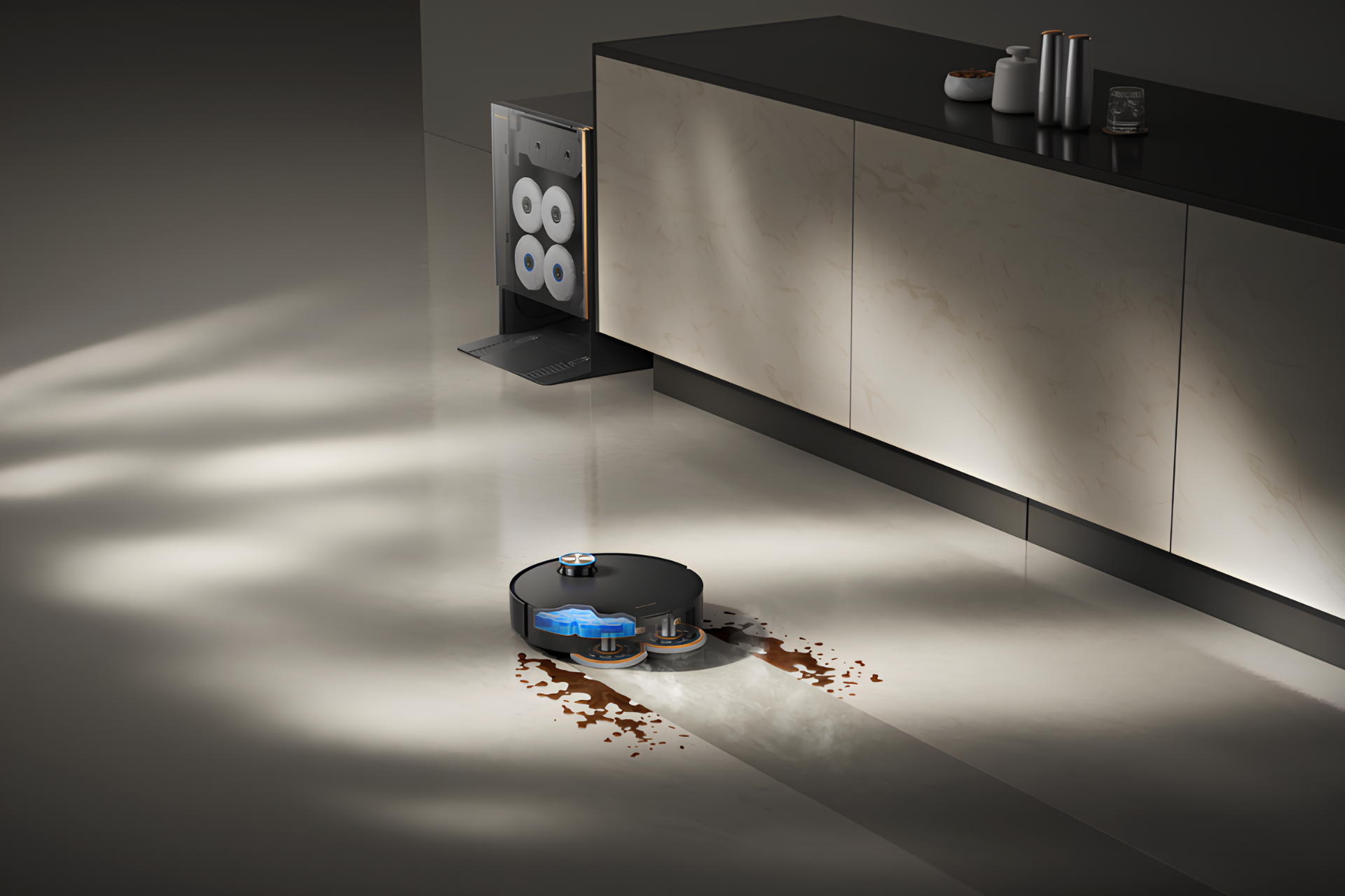 Док-станция не только заряжает девайс, очищает пылесборник, заправляет бак робота водой, моет швабры горячей водой при температуре 100°С и сушит их — она умеет автоматически менять моющие насадки. Внутри хранятся три пары: