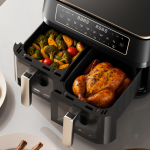 Две независимые зоны позволяют жарить, запекать или разогревать разные продукты одновременно. Говорят, что девайс удерживает до 72.8% влаги и не пересушивает еду. Обдув потоком горячего воздуха идет сверху и снизу — переворачивать продукты в процессе готовки не нужно.