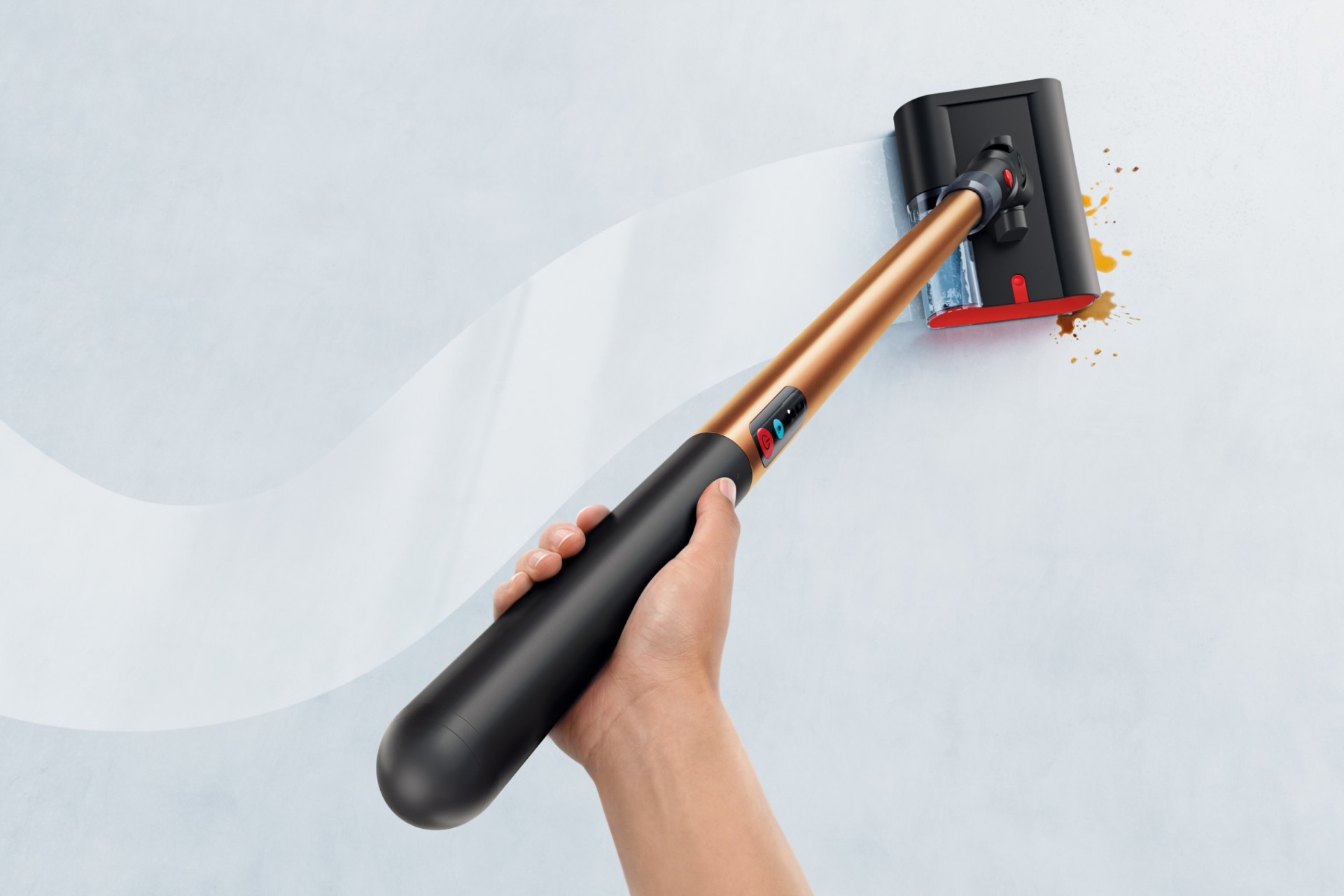 Диаметр ручки остался таким же — 3.8 см. Внутри размещены мотор, аккумулятор и вся электроника. Вместо контейнера для пыли здесь установлен бак для воды. Весит девайс 2.2 кг — немного больше, чем «сухая» версия.