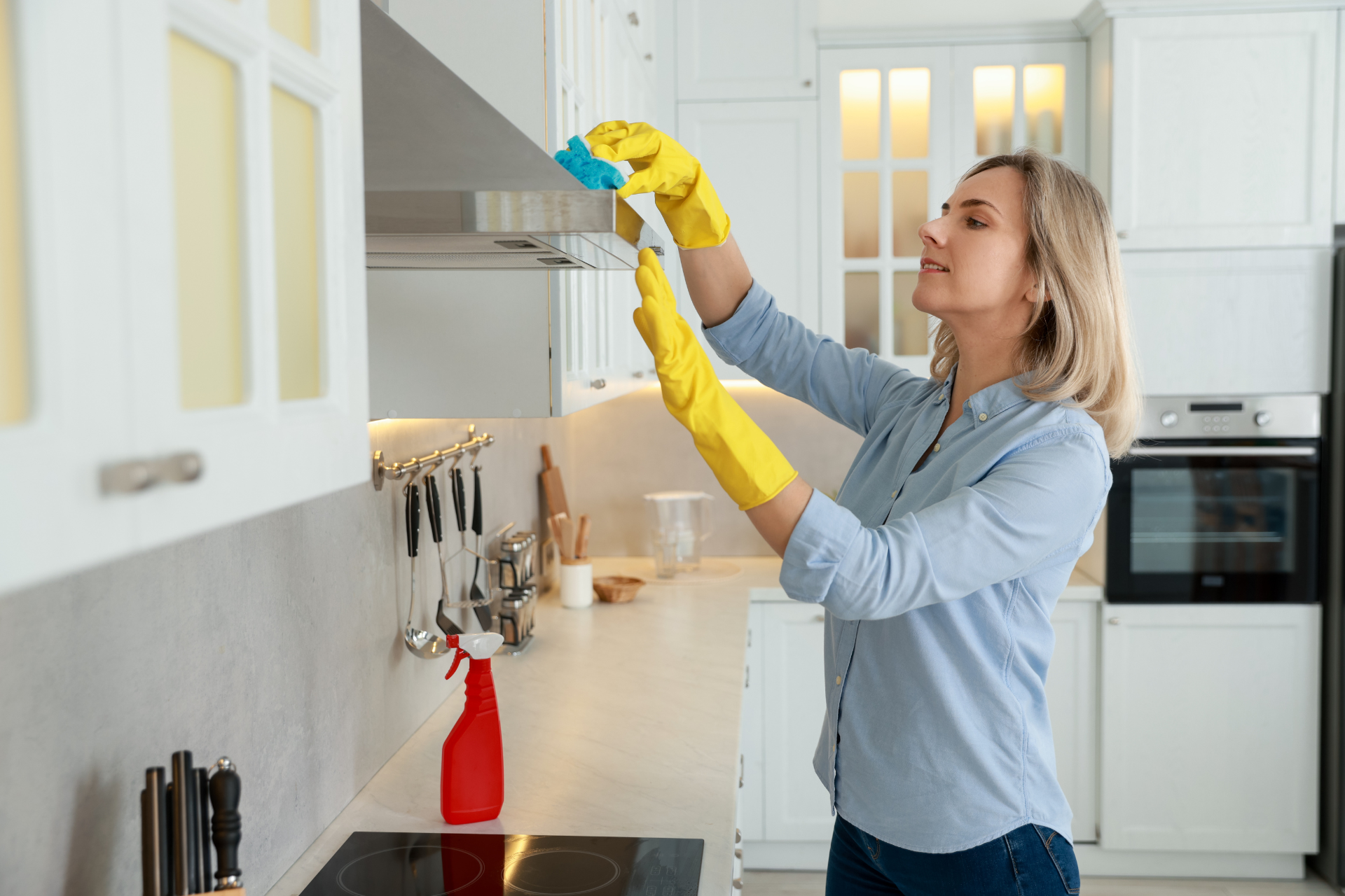 • Пройдитесь салфеткой по фасадам техники и шкафов, зеркальные поверхности — спреем для стекол.