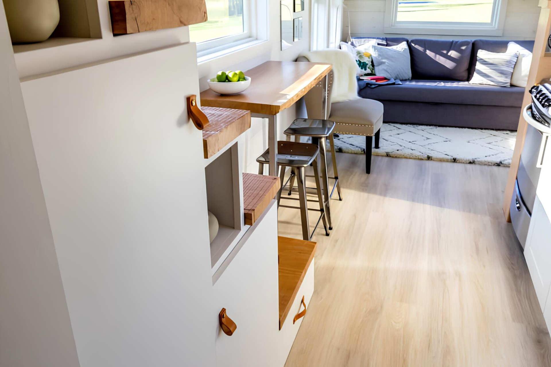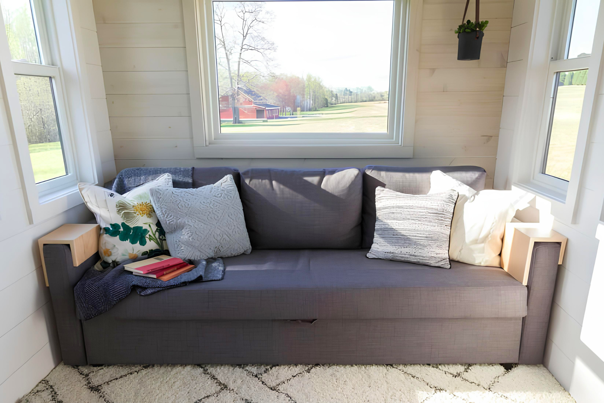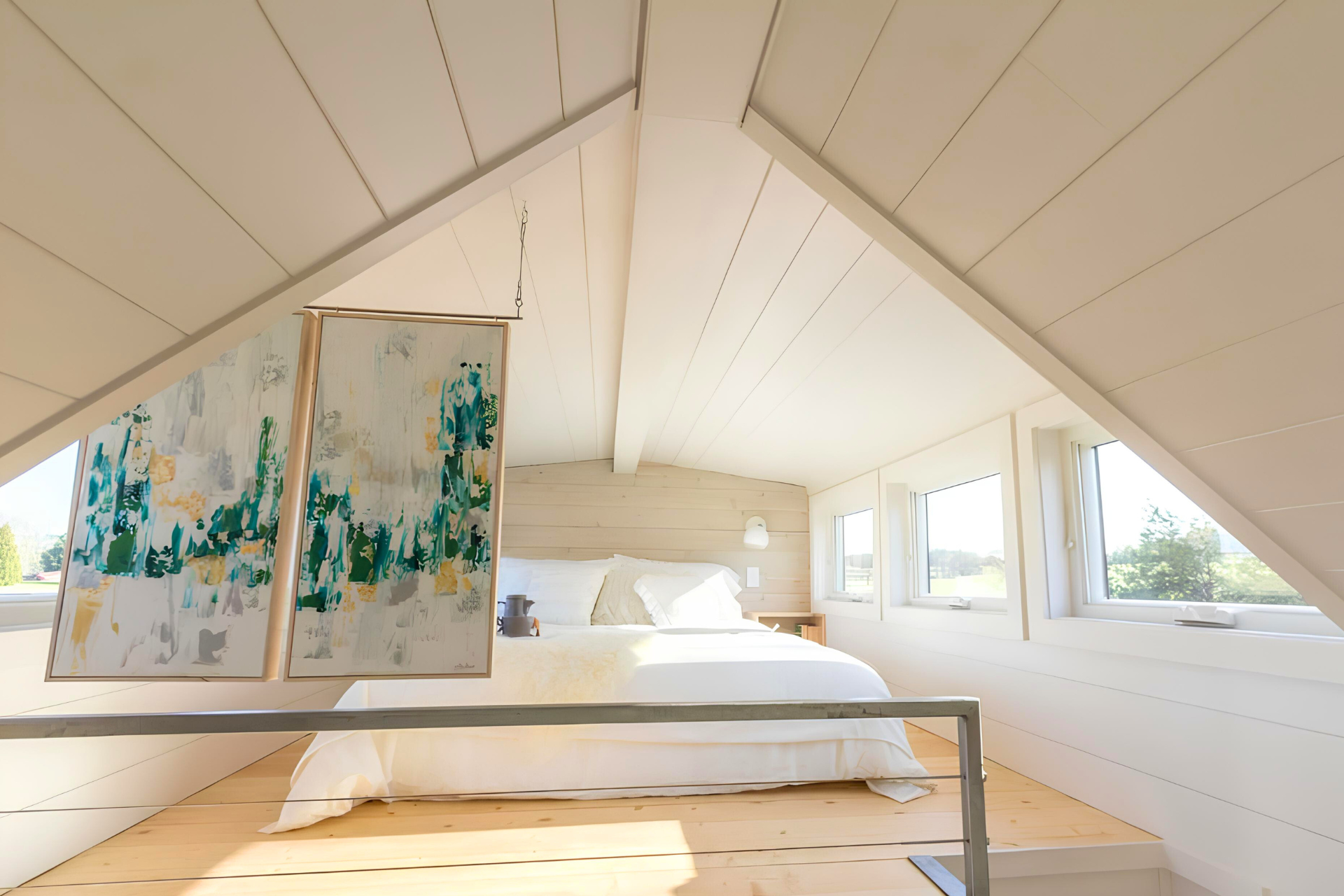 На первом этаже — кухня с небольшой обеденной зоной, гостиная и полноценная ванная с туалетом и душем. В спальне наверху помещается просторная кровать.