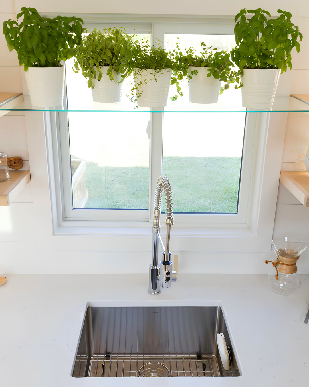 За счет этого решения мини-дом ощущается просторнее типичных построек такого формата. Внутри все выдержано в белом цвете, много естественного света — в доме 20 окон.