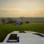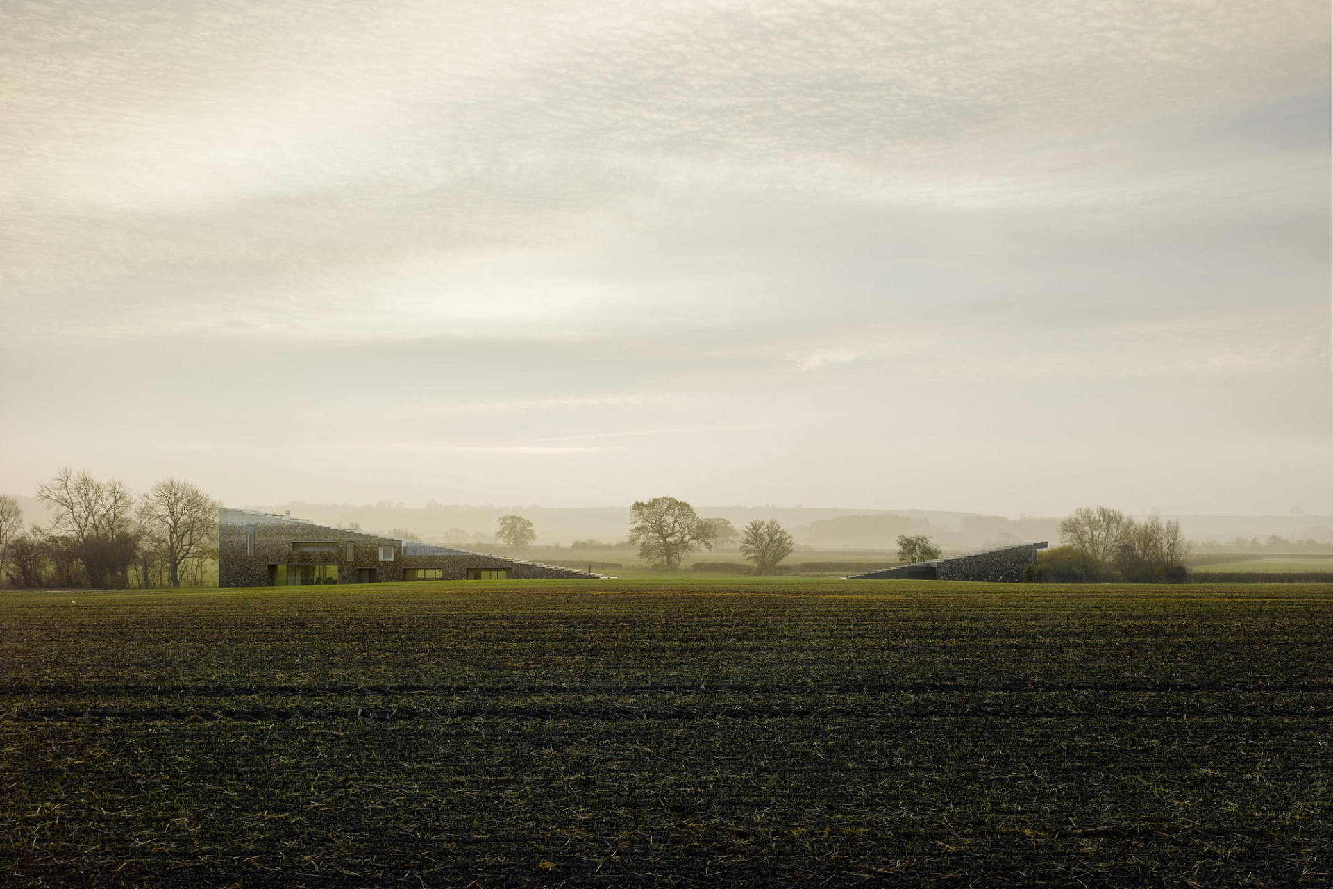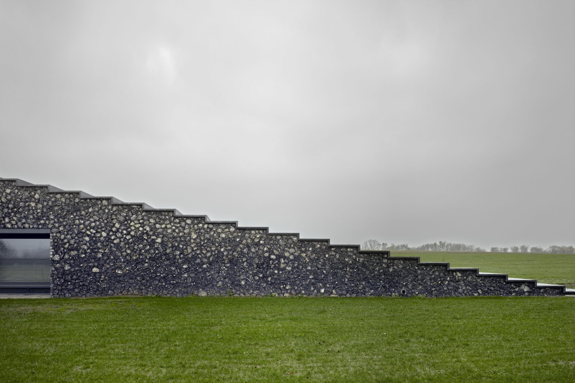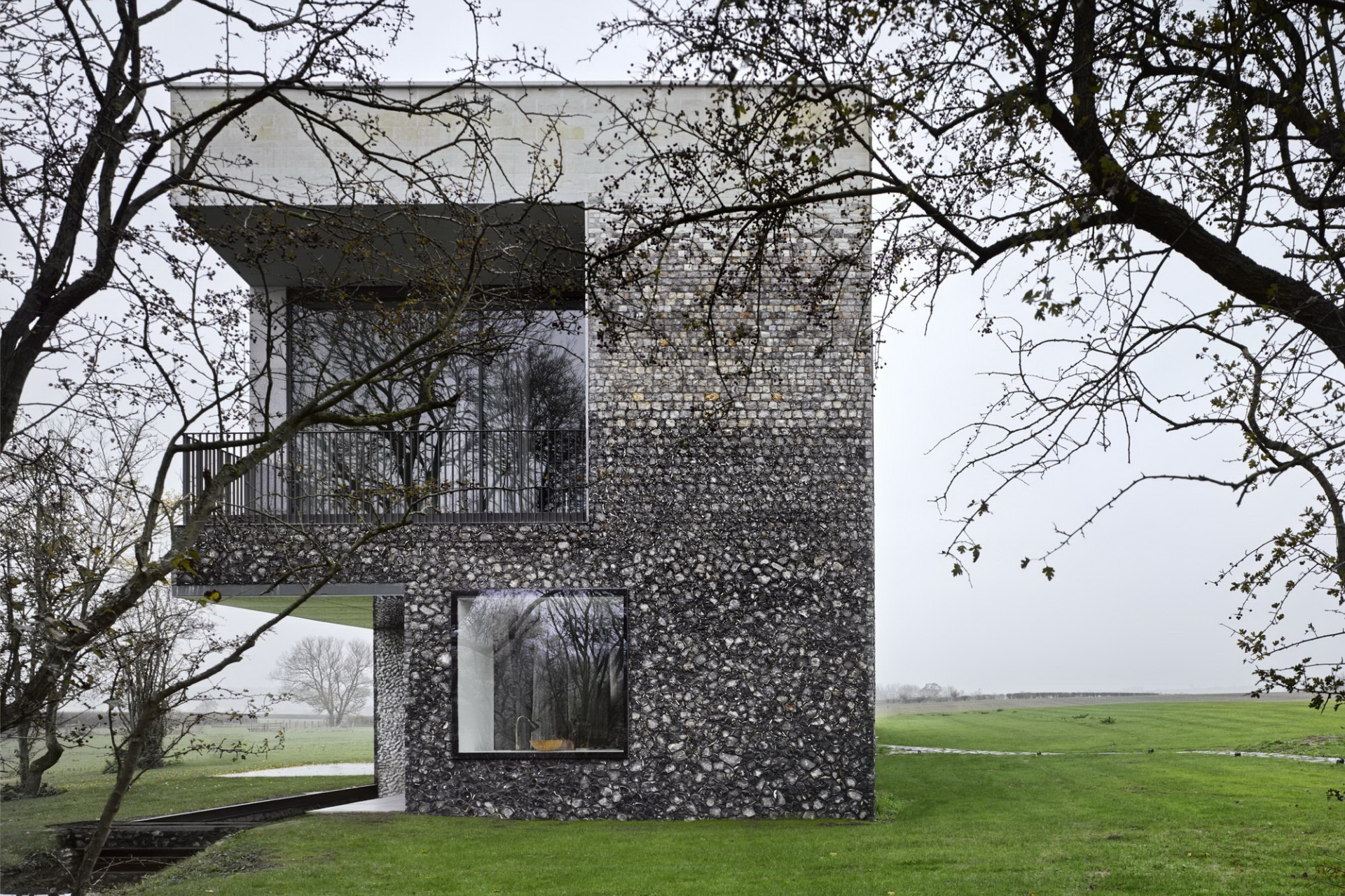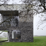 Архитекторы постарались сделать так, чтобы дом выглядел естественной частью пейзажа. Район известен меловыми холмами, где часто встречается кремень, поэтому именно этот материал стал основой проекта.