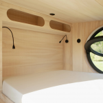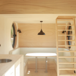 При длине 6.6 м и площади 22 м² дом вмещает до шести человек. На первом этаже — кухня-гостиная с индукционной плитой, духовкой, складным столом и диваном, который превращается в двухместную кровать, а также небольшой санузел с душем и туалетом. Наверху — две спальни.