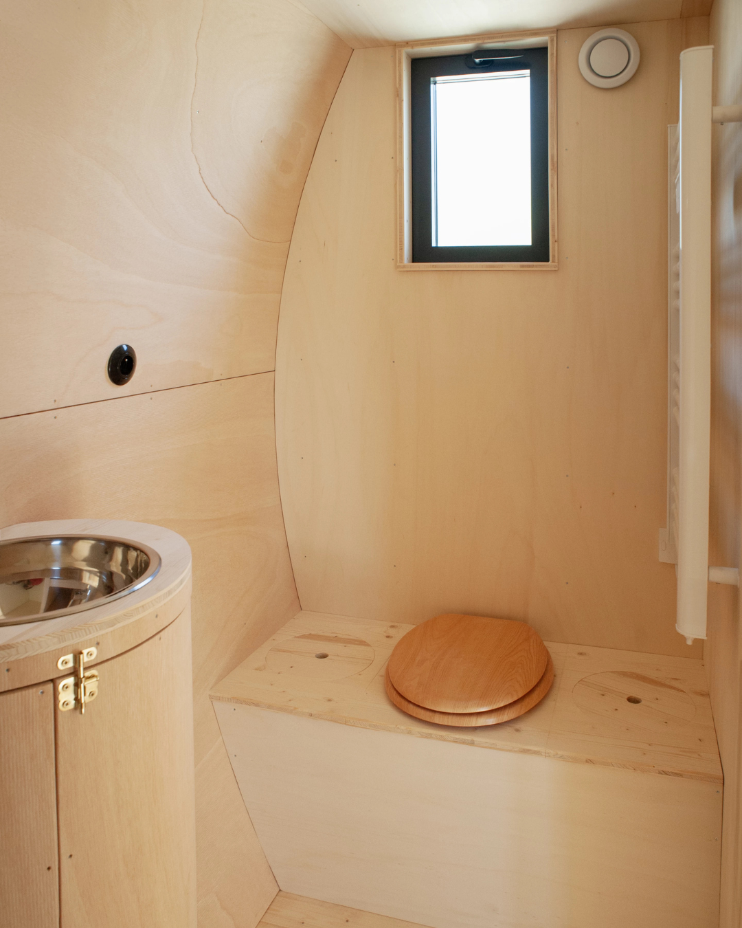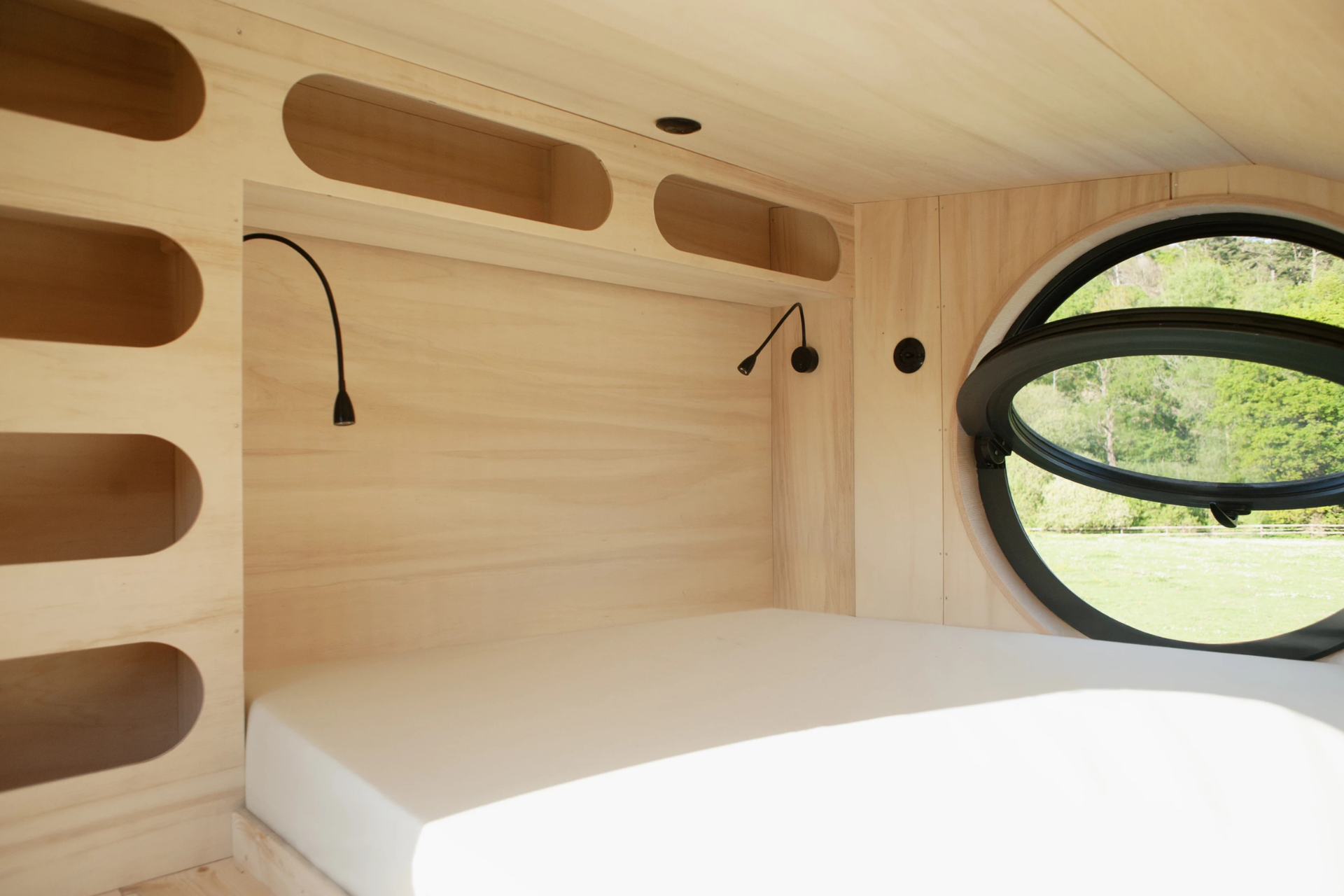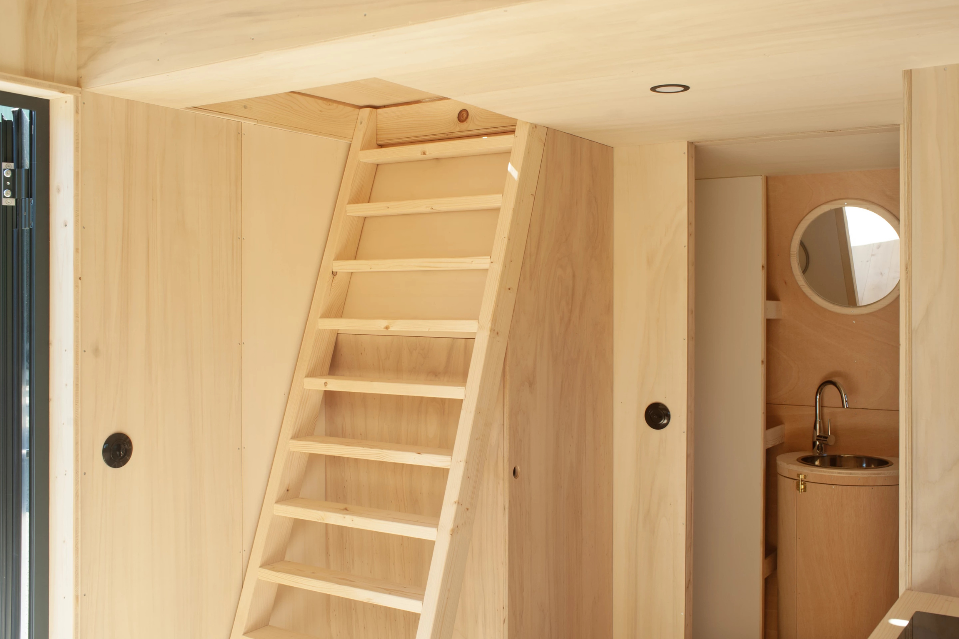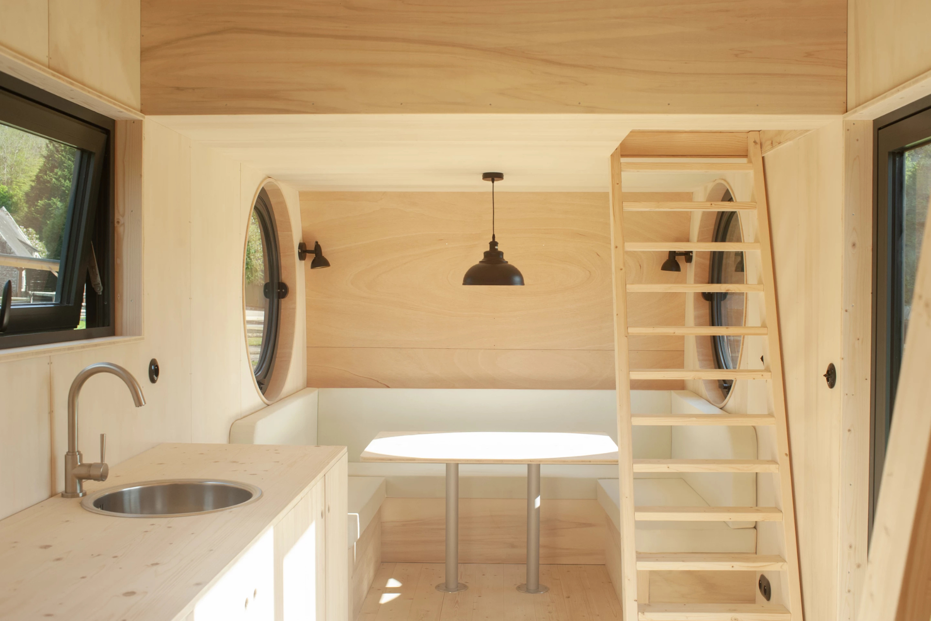 При длине 6.6 м и площади 22 м² дом вмещает до шести человек. На первом этаже — кухня-гостиная с индукционной плитой, духовкой, складным столом и диваном, который превращается в двухместную кровать, а также небольшой санузел с душем и туалетом. Наверху — две спальни.