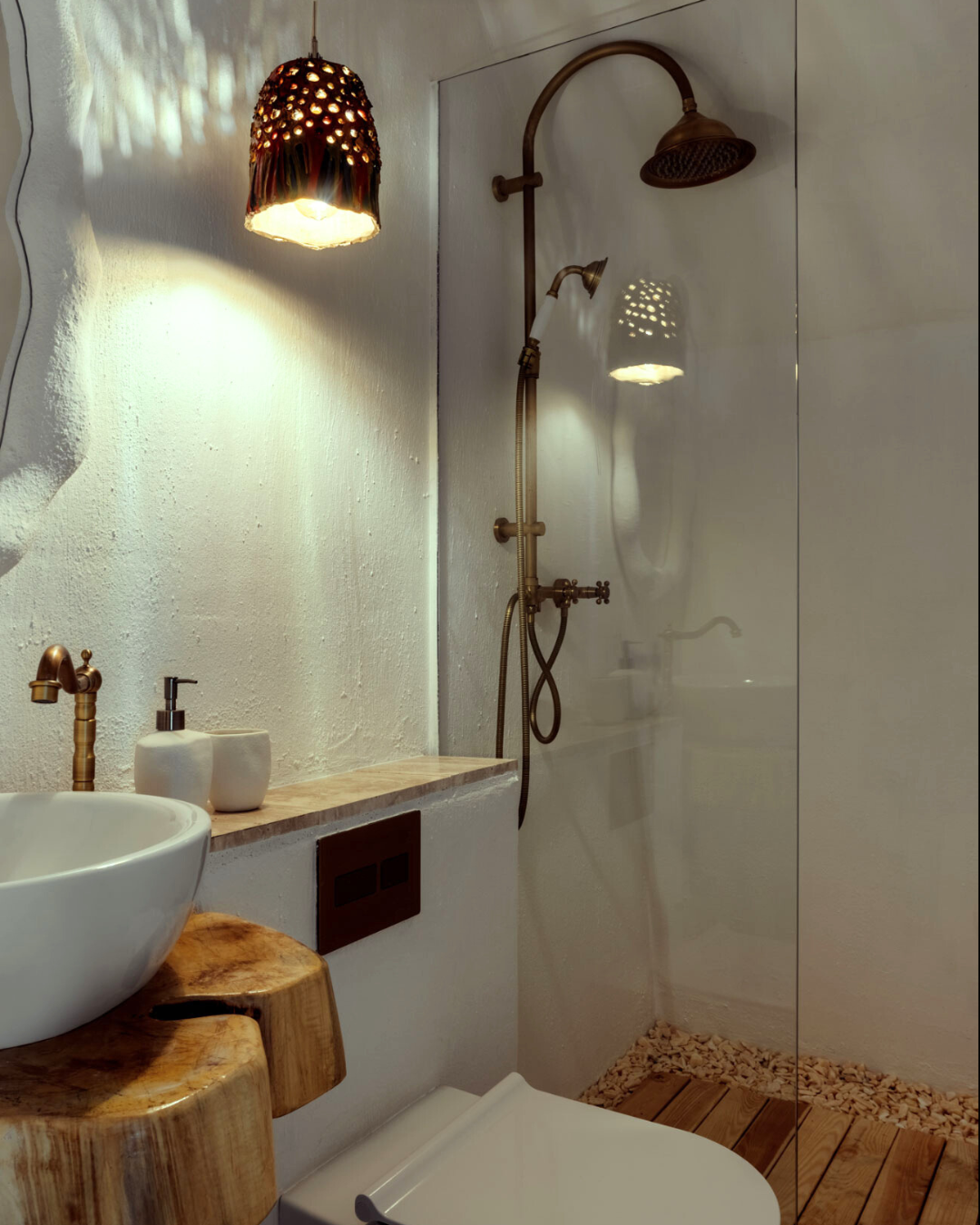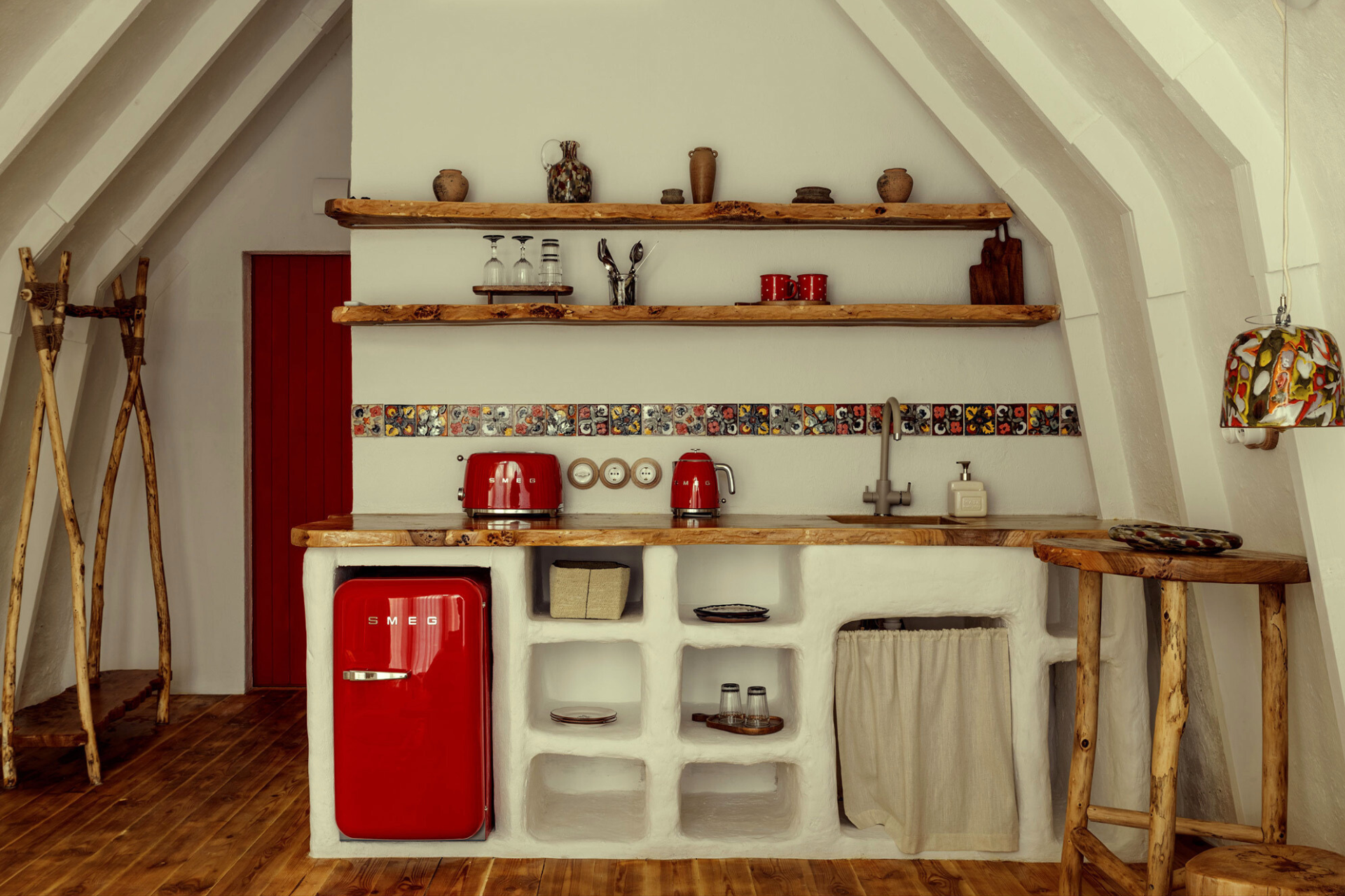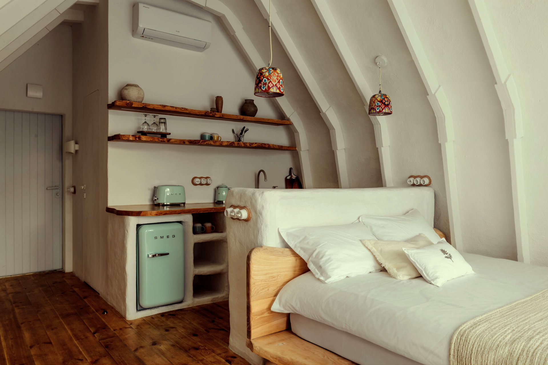 Экодомики стоят прямо у воды, рядом с первым в стране вейк-парком. Вместо привычных материалов архитекторы использовали глину, солому и известковую штукатурку. Такая конструкция создает естественный микроклимат: стены дышат, удерживают тепло и регулируют влажность. Мебель и светильники сделали местные мастера.
