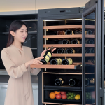 Холодильник рассчитан на 101 бутылку. Внутри — три зоны охлаждения с полками из дерева и регулировкой температуры от 3 до 18°C. Помимо вина, можно хранить сыр, фрукты, ветчину и орехи — для них есть отдельная секция. Дверца блокирует до 92% ультрафиолета и открывается касанием или голосом.