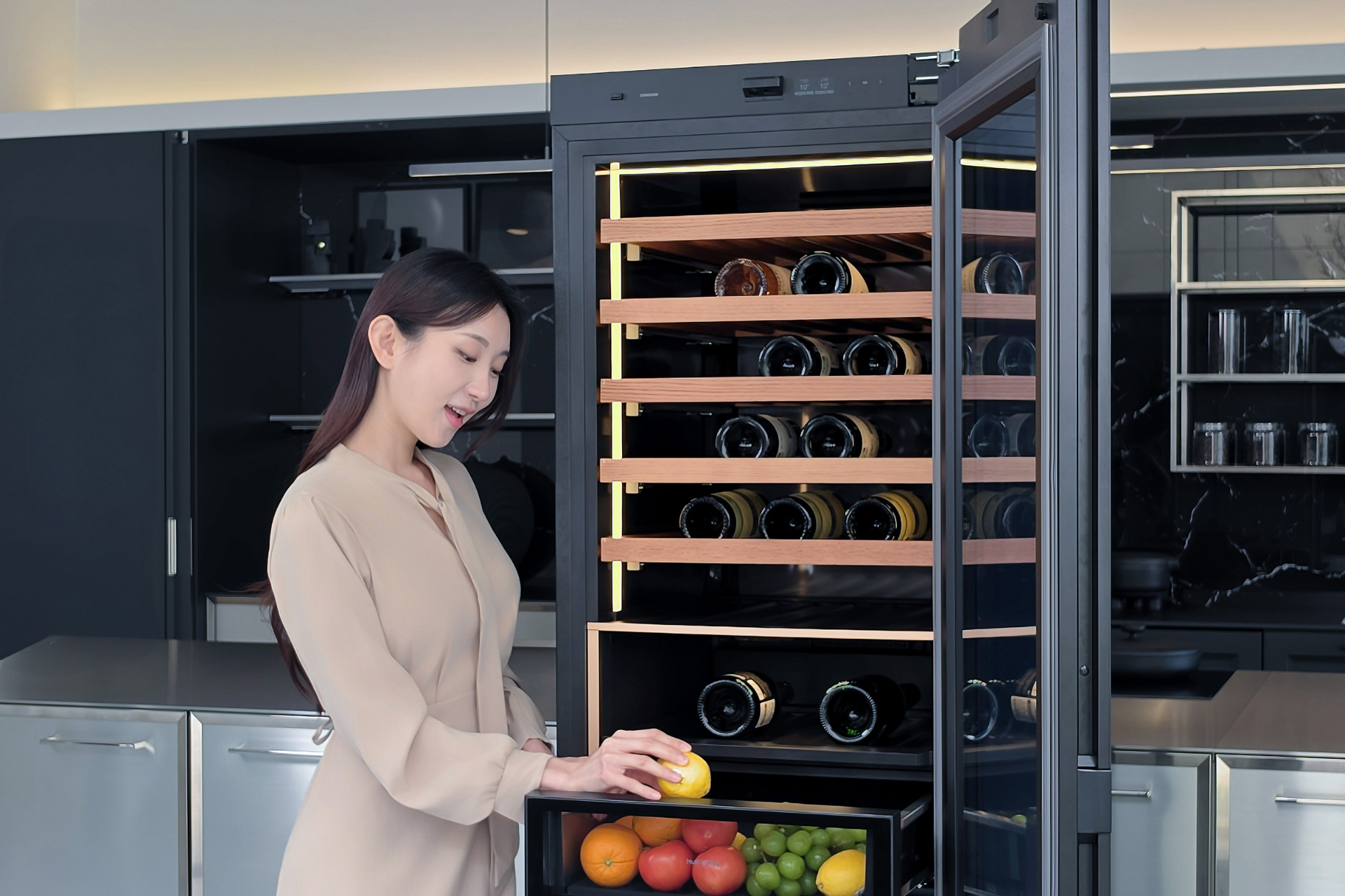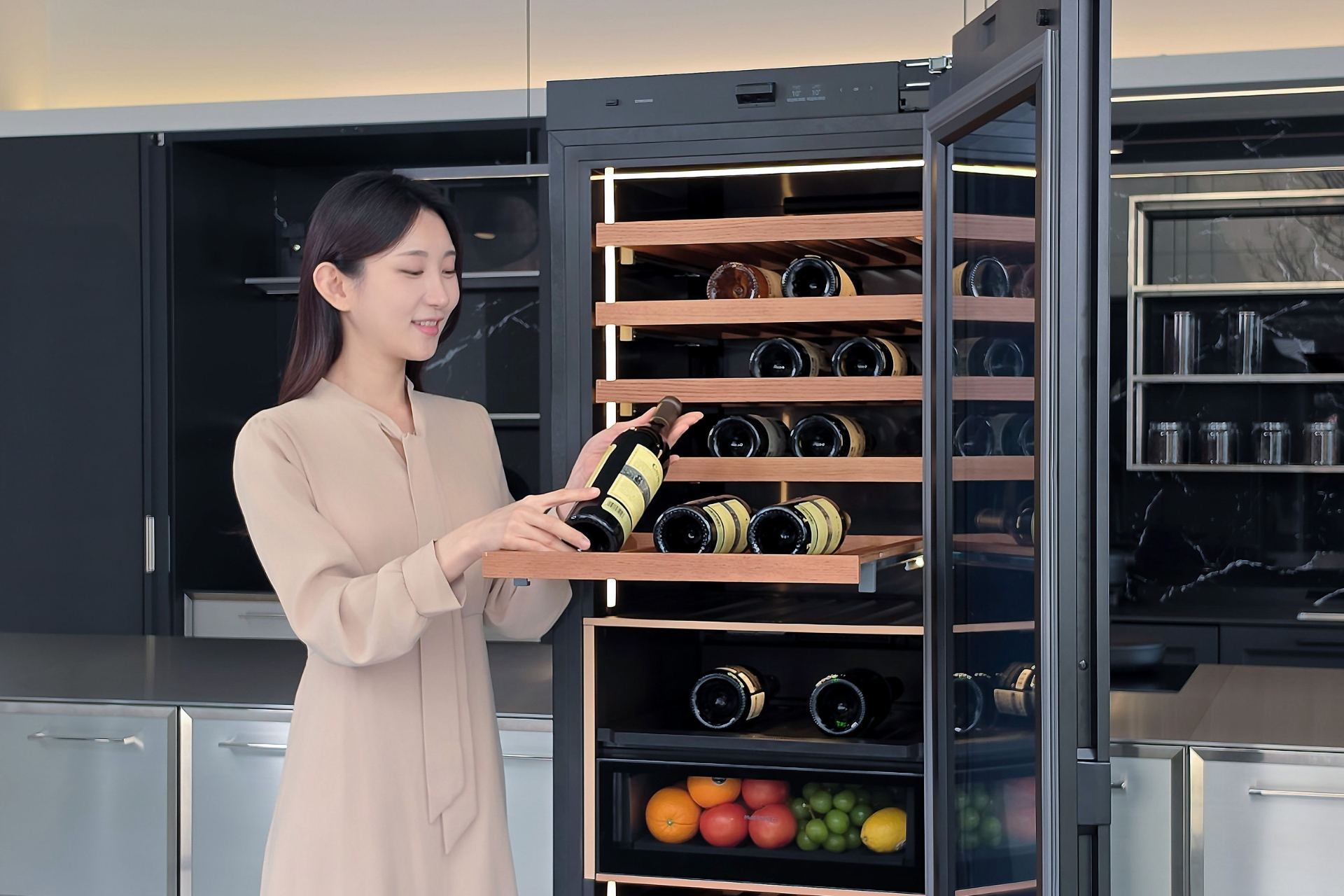 Система AI Wine Manager сканирует этикетки бутылок и сохраняет информацию о вине — название, сорт винограда и год урожая. В приложении SmartThings можно посмотреть состав коллекции и получить рекомендации по блюдам, подходящим к выбранному вину.