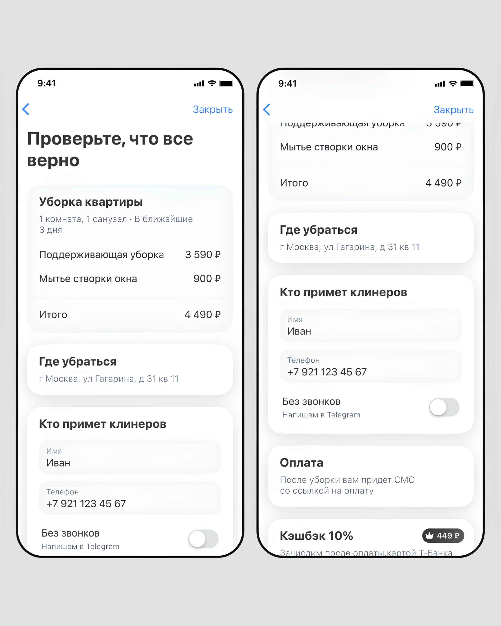 Оплата — после завершения уборки, предоплаты нет. Все вопросы решаются через чат поддержки. Исполнитель — Airo, проверенная компания с большим опытом в клининге. Пока сервис работает в Москве, позже его обещают расширить.
