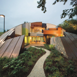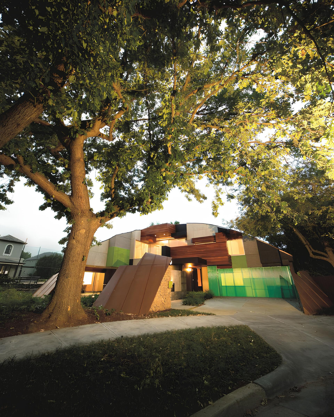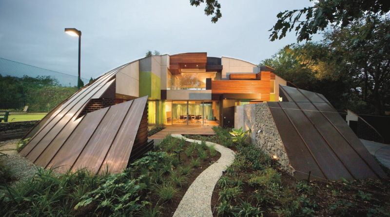 Дом выглядит как объемный пазл: сводчатая крыша и стены собраны из фрагментов разного размера, часть элементов словно отсутствует, открывая вид на вход и внутренний двор. Купол облицован медными панелями, которые со временем будут естественно меняться и стареть.
