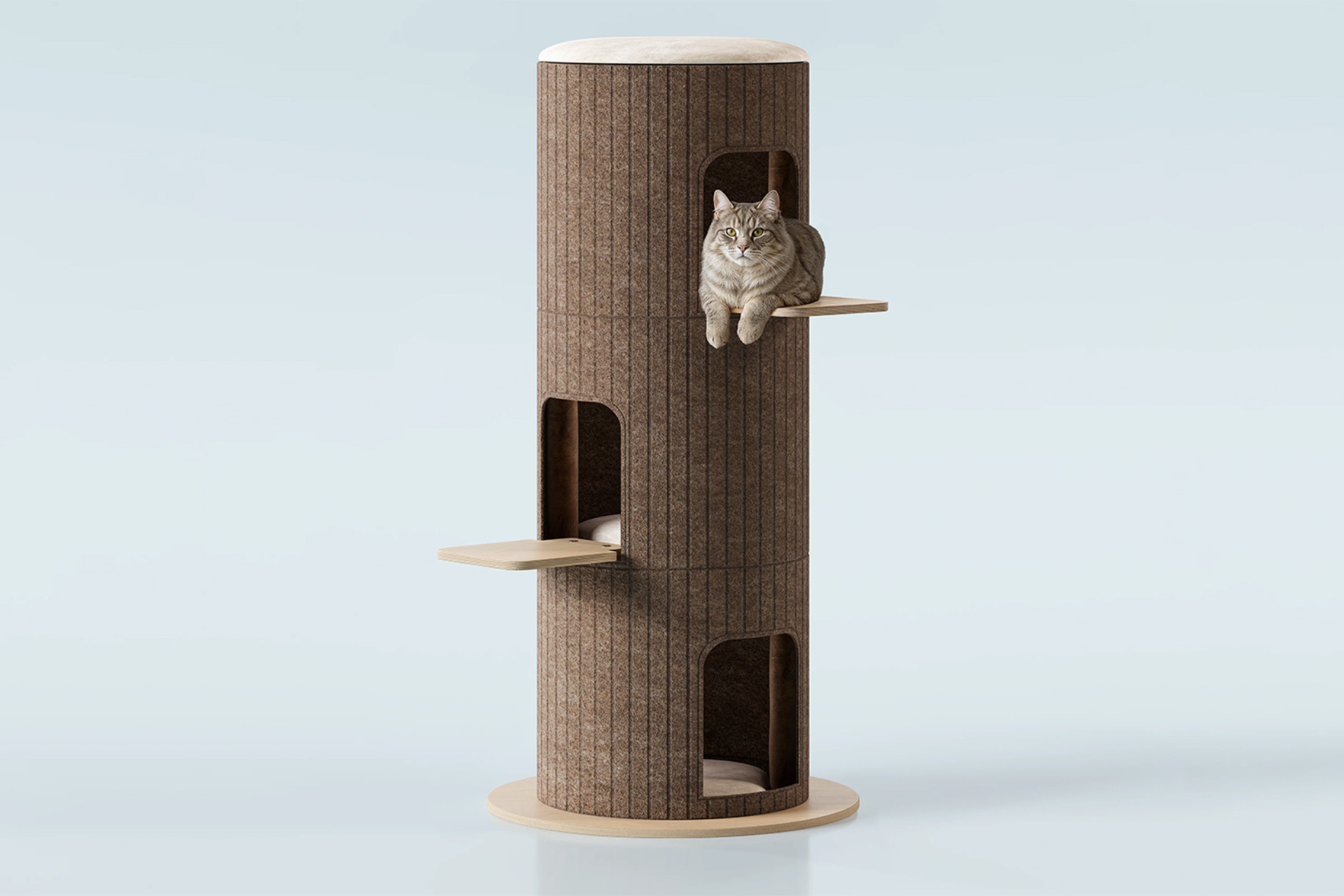 Компания Meowpy выпустила «елочный» домик для хвостатых. Основа — обычный домик-когтеточка, состоящий из трех уровней с мягкими подушками и скрытыми проходами, где кошки могут лазить, прятаться и отдыхать.