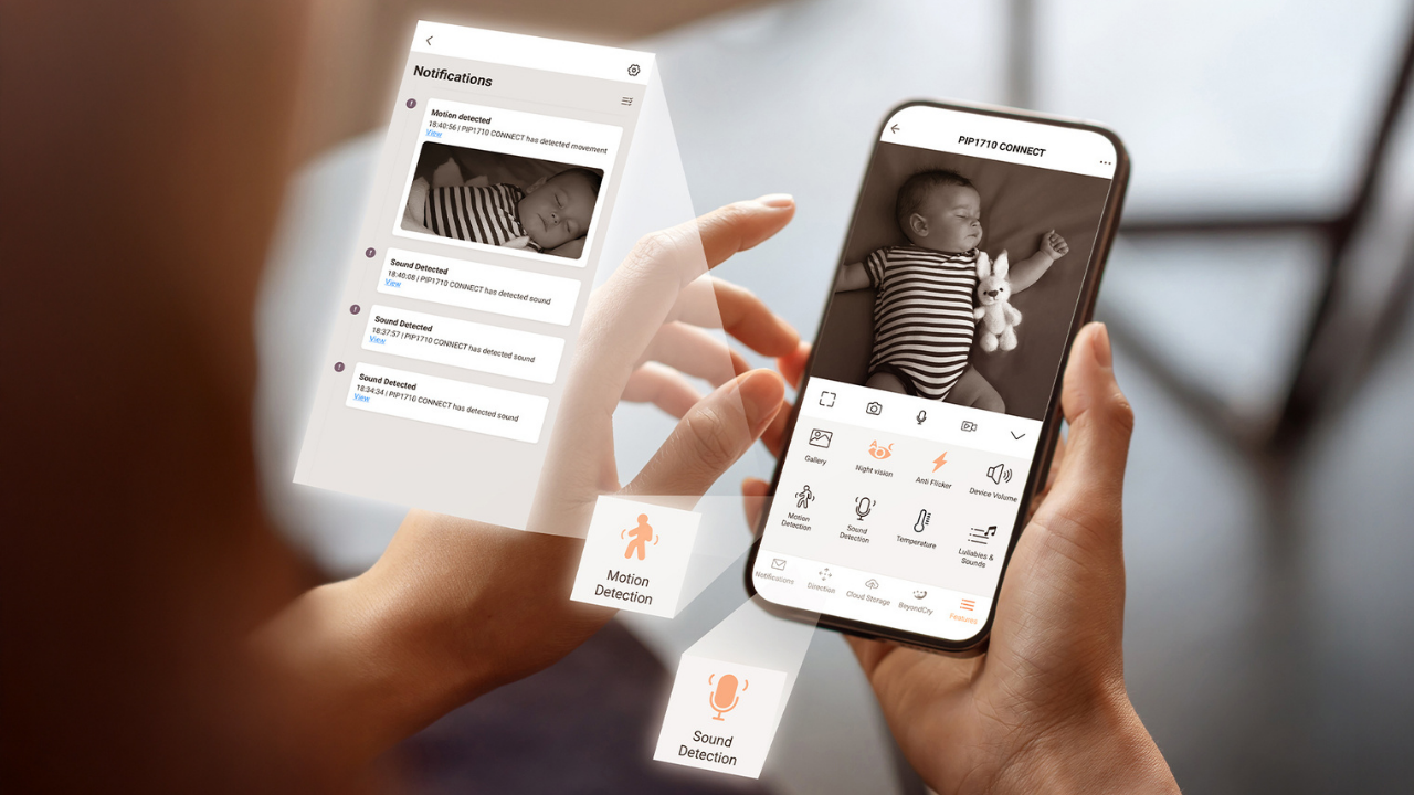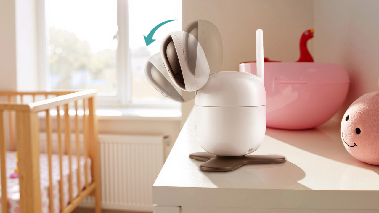 Nursery PIP1710 снимает в Full HD, видит в темноте и может наклоняться, чтобы менять угол обзора. Система присылает уведомления о плаче, движении и изменении температуры. Для разговоров с малышом есть двусторонняя связь.