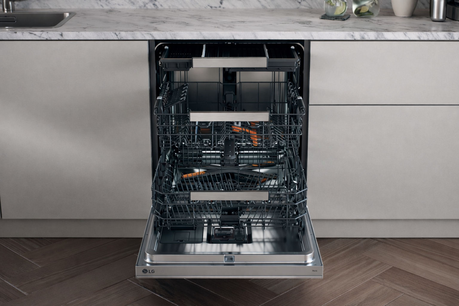 Также заявлена функция мытья бутылок и стаканов — форсунки направляют поток воды внутрь узких емкостей. На корпусе есть скрытый LED-дисплей, а внутренняя подсветка упрощает загрузку и выгрузку посуды.