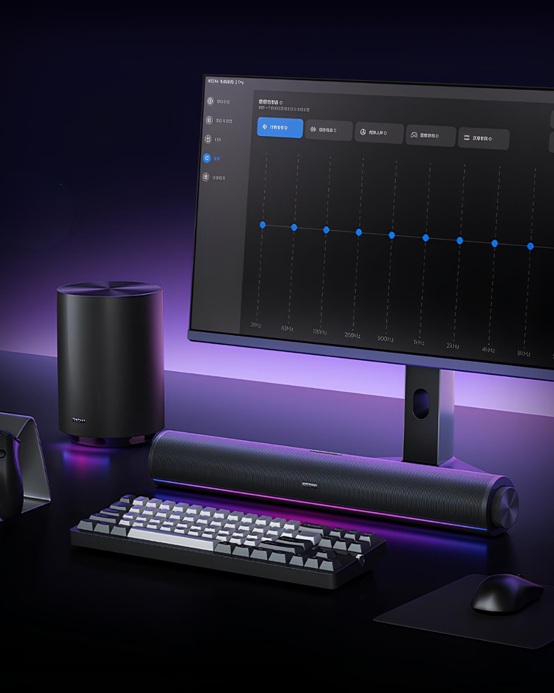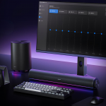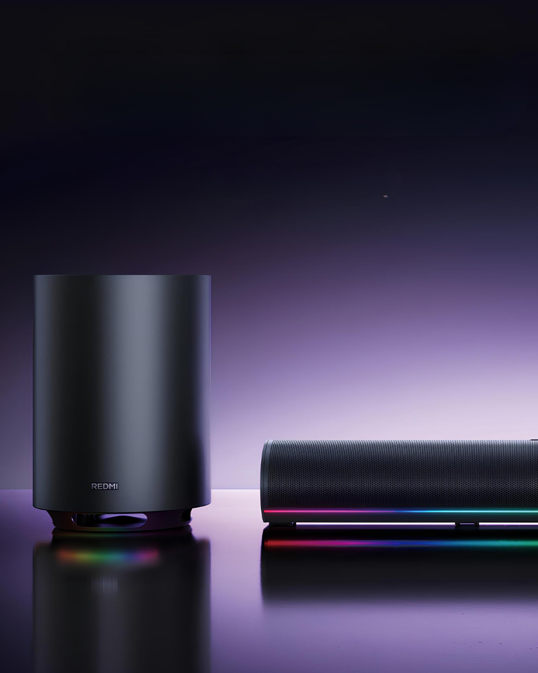 В комплект входят компактный саундбар и сабвуфер. Саундбар получил два динамика по 10 Вт и пару пассивных излучателей, за счет чего звук получается шире и объемнее. Беспроводной сабвуфер оснащен 96-мм низкочастотным динамиком и RGB-подсветкой, которая может работать в такт музыке.