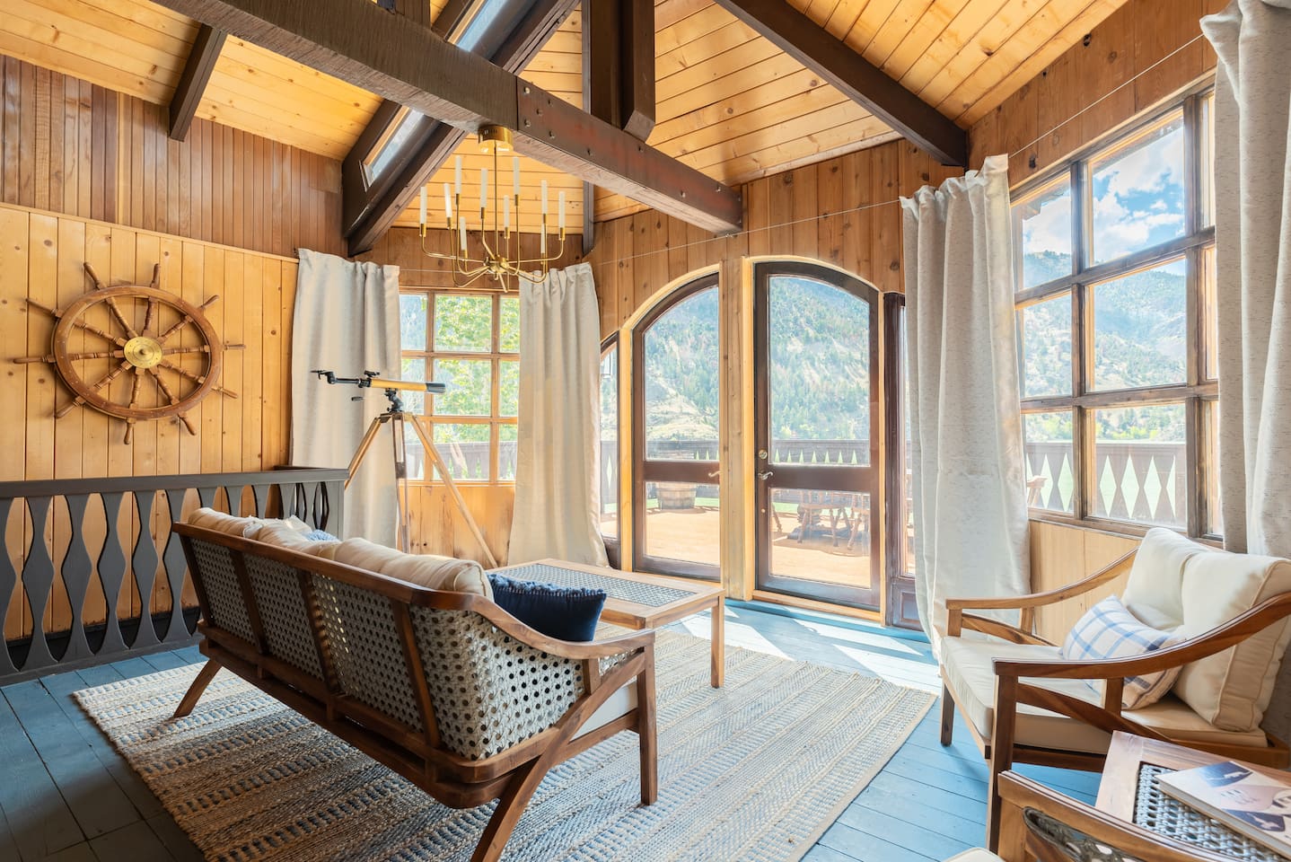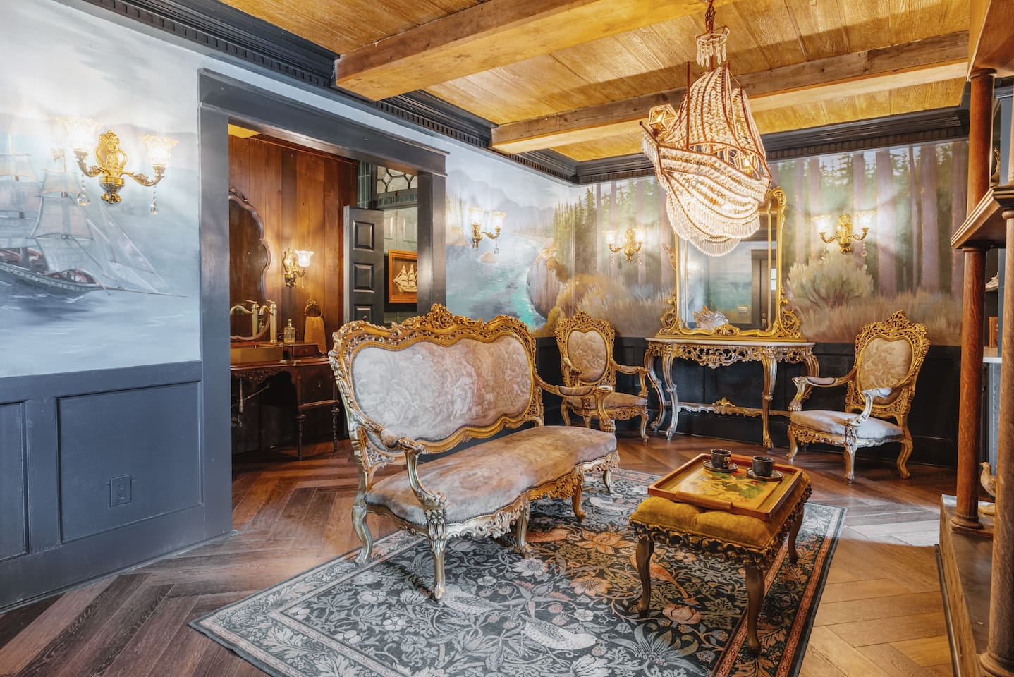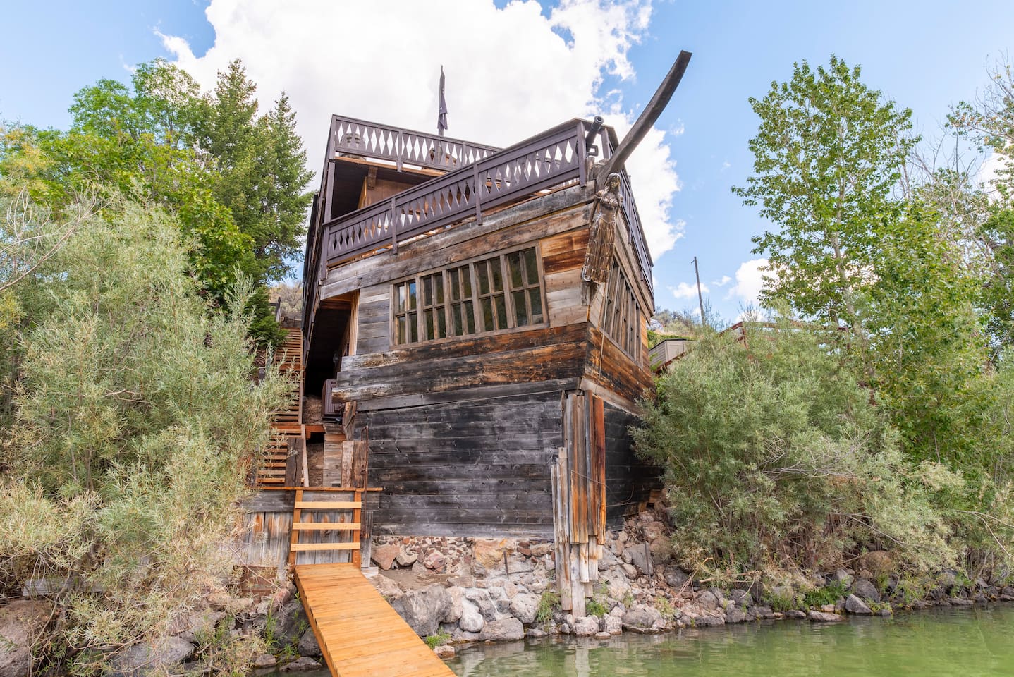 Он стоит прямо у озера и выглядит как пришвартованный корабль. Внутри — просторная кухня, гостиная, две спальни (одна из них — «каюта капитана» с более дорогой отделкой) и две ванные. Плюс есть собственный причал и быстрый Wi-Fi. А еще в стоимость входят пиратские костюмы, так что в образ можно войти сразу после заселения.