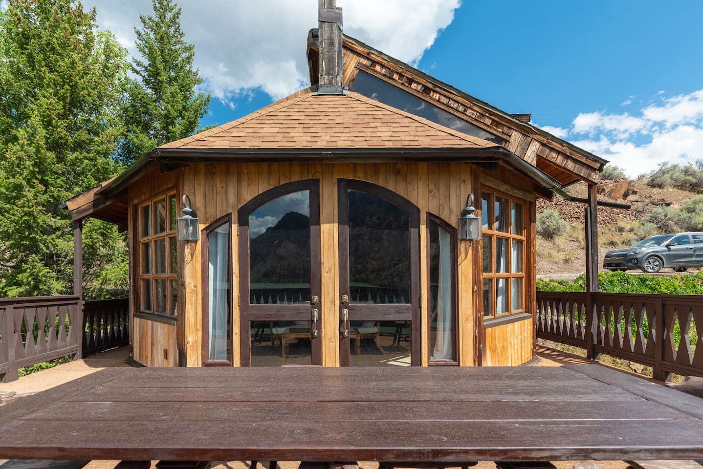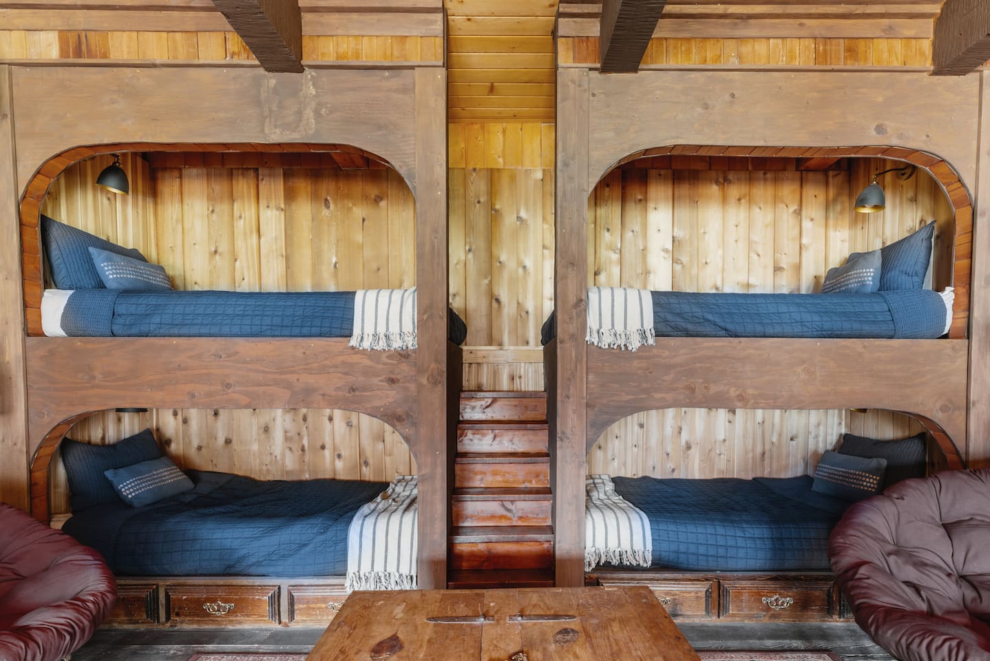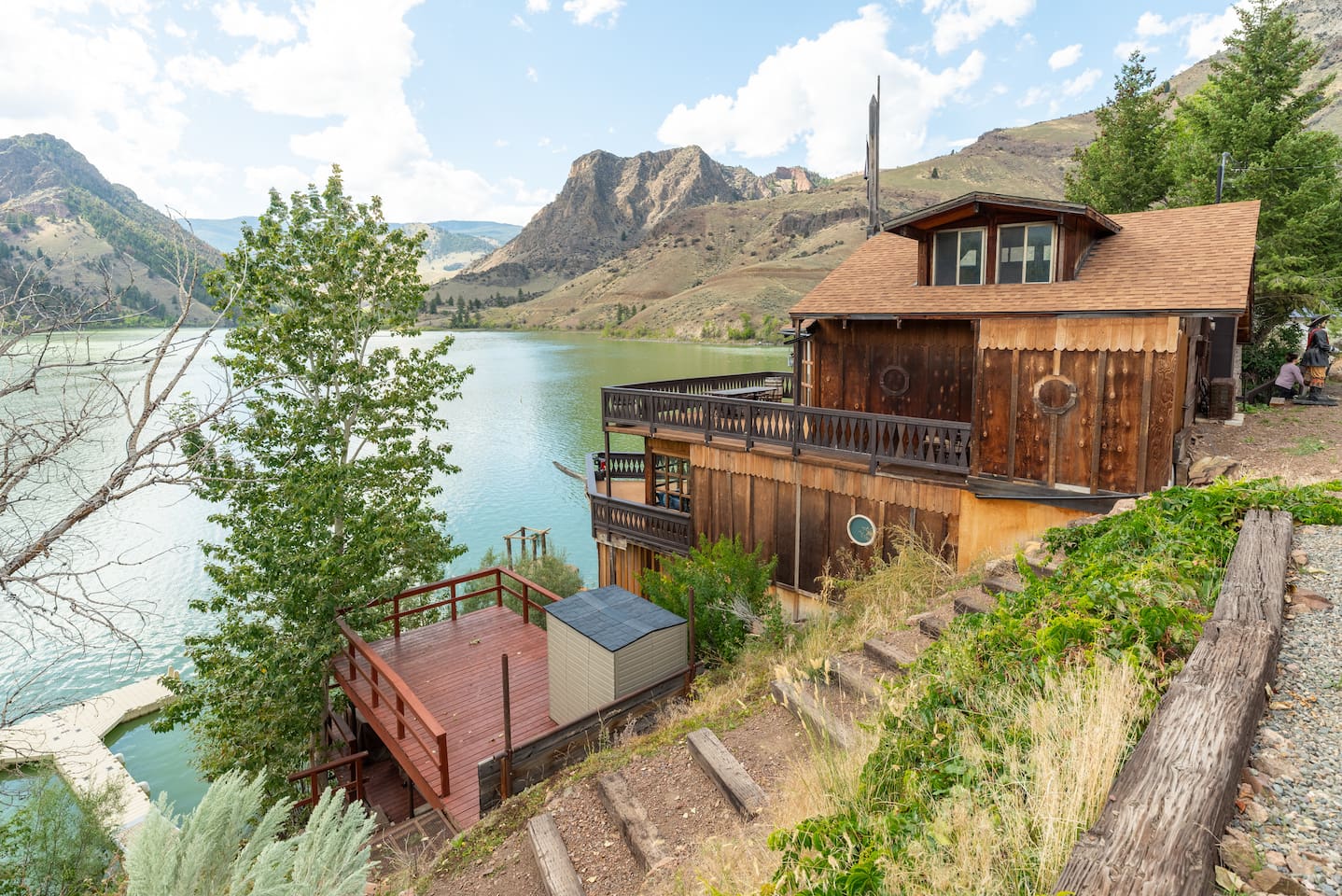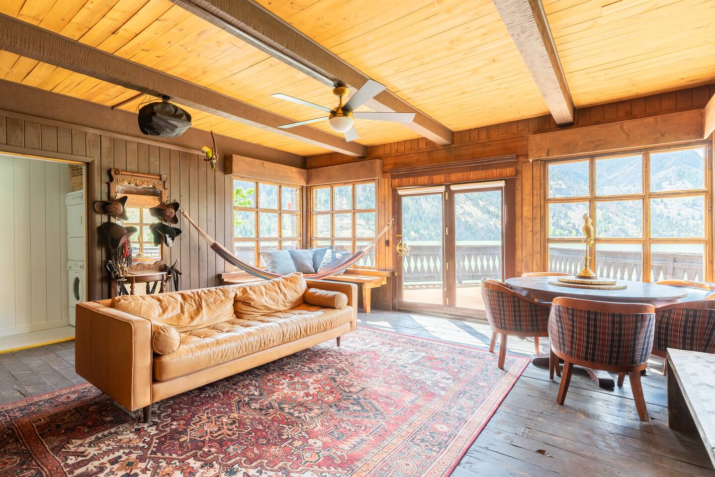 Он стоит прямо у озера и выглядит как пришвартованный корабль. Внутри — просторная кухня, гостиная, две спальни (одна из них — «каюта капитана» с более дорогой отделкой) и две ванные. Плюс есть собственный причал и быстрый Wi-Fi. А еще в стоимость входят пиратские костюмы, так что в образ можно войти сразу после заселения.