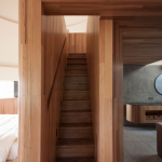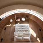 Внутри — минималистичное пространство для отдыха: большая кровать, стол, стулья и панорамное окно с видом на лес. Конструкцию приподняли на стальном каркасе, чтобы меньше вмешиваться в природный ландшафт.