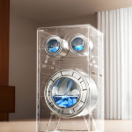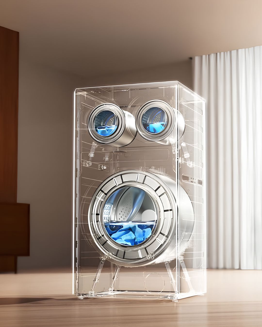 У нее три барабана: большой на 12 кг и два маленьких по 1 кг. Они подключены к отдельным водяным контурам, поэтому можно одновременно запускать разные стирки — например, белые вещи отдельно, деликатные отдельно. В режиме сушки большой барабан вмещает до 9 кг, малые — по 0.5.