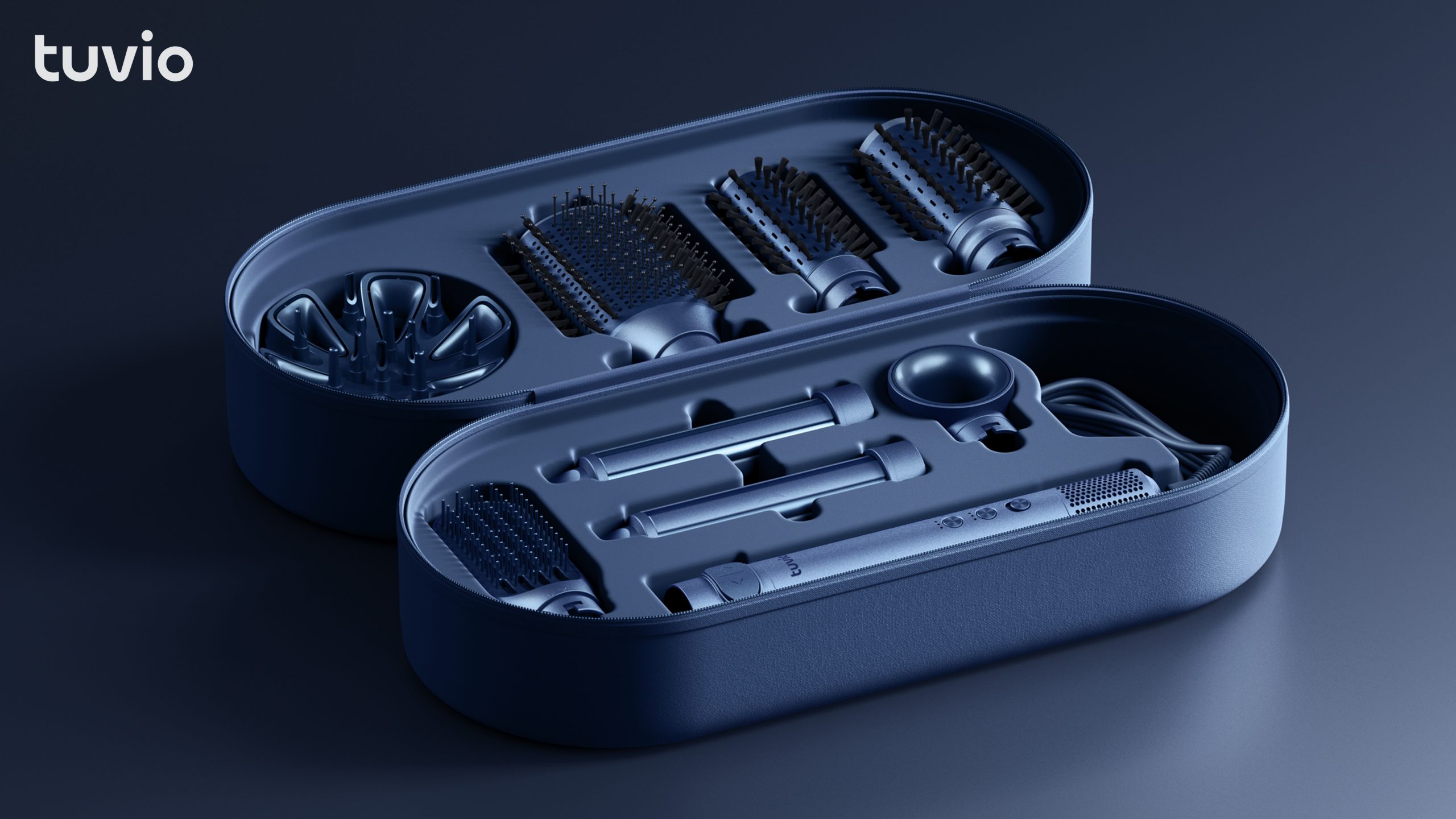 Яндекс Фабрика выпустила фен Tuvio HBI1417 с восемью насадками — он совмещает фен-стайлер и фен-щетку с вращением.