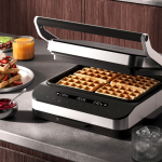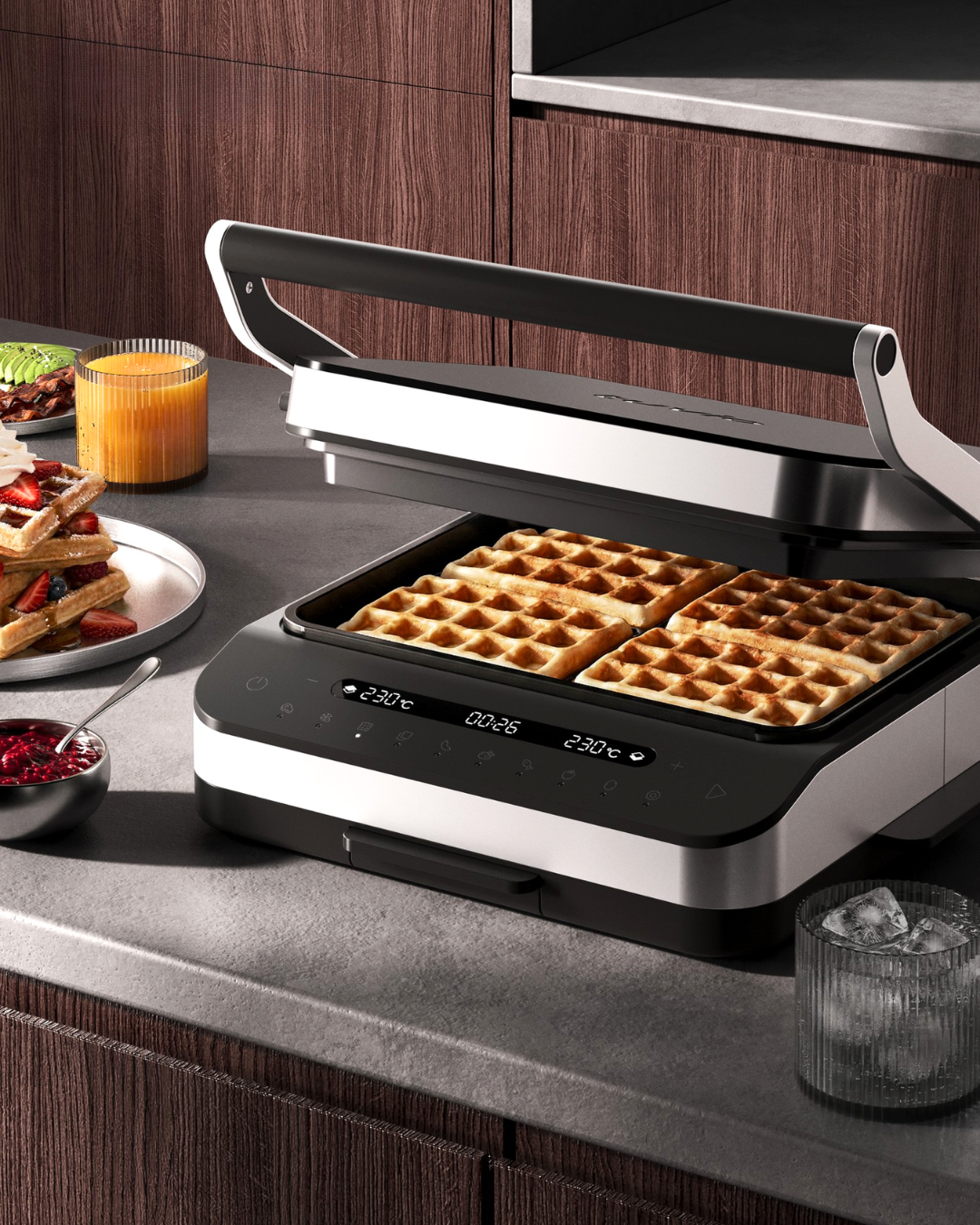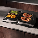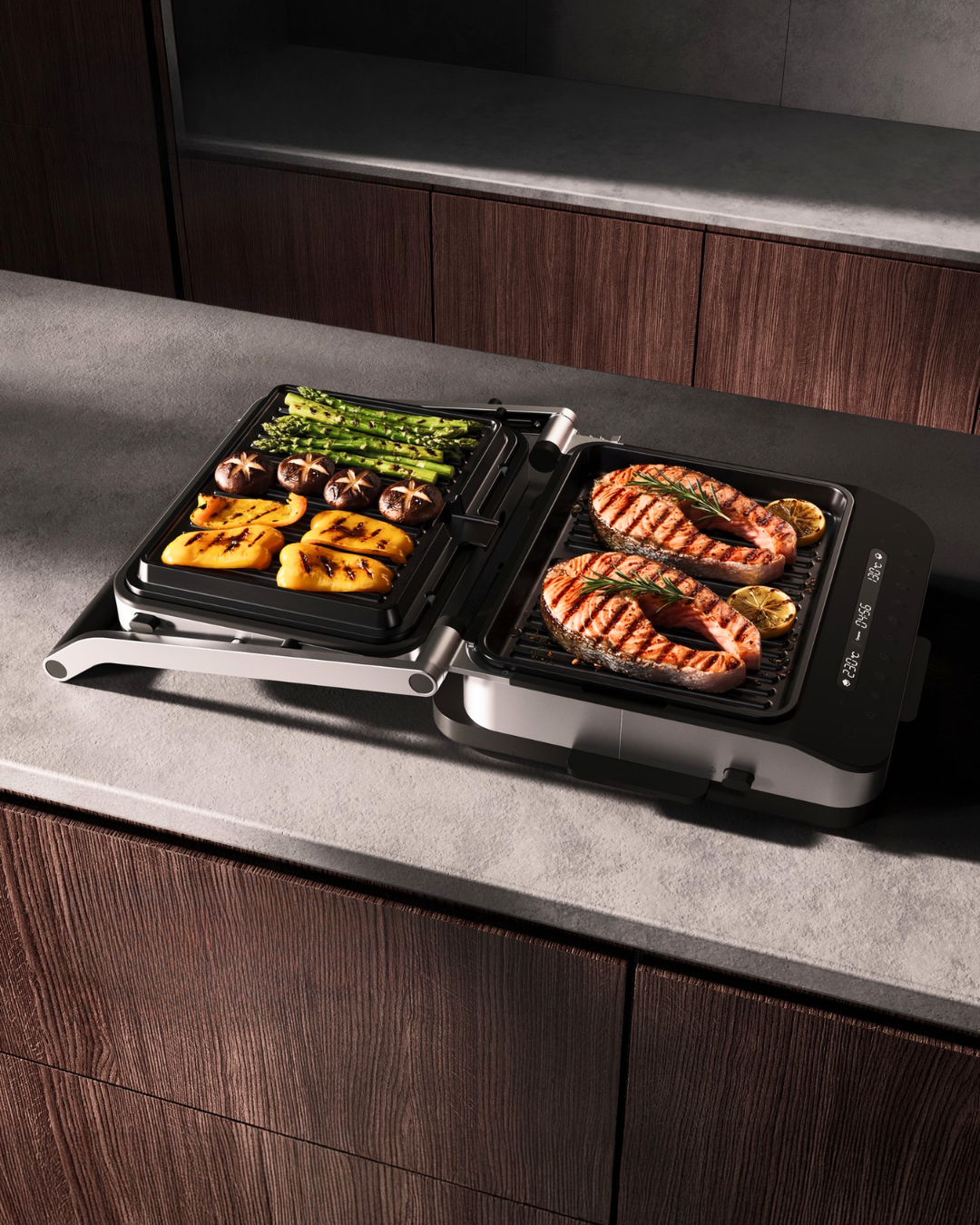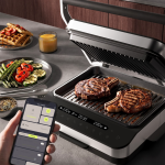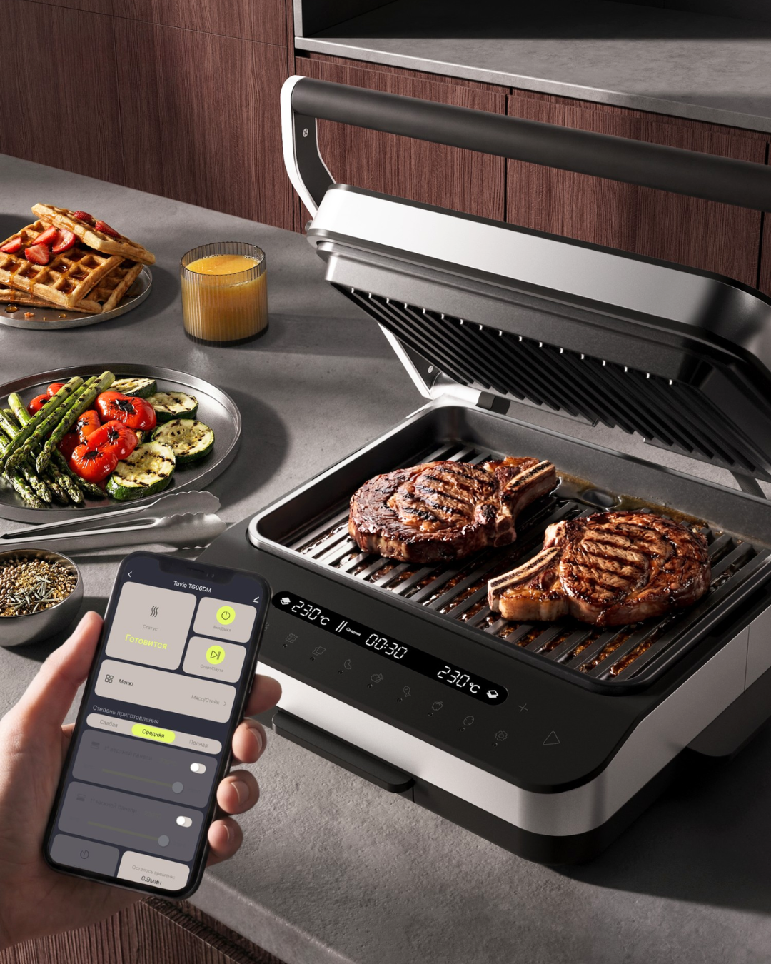 Он получил 11 автопрограмм для разных продуктов: от овощей и рыбы до бекона, курицы и вафель (панель для них идет в комплекте). Для мяса доступны три степени прожарки — встроенный датчик учитывает толщину стейка и сам подбирает время. Верхняя панель регулируется по высоте.