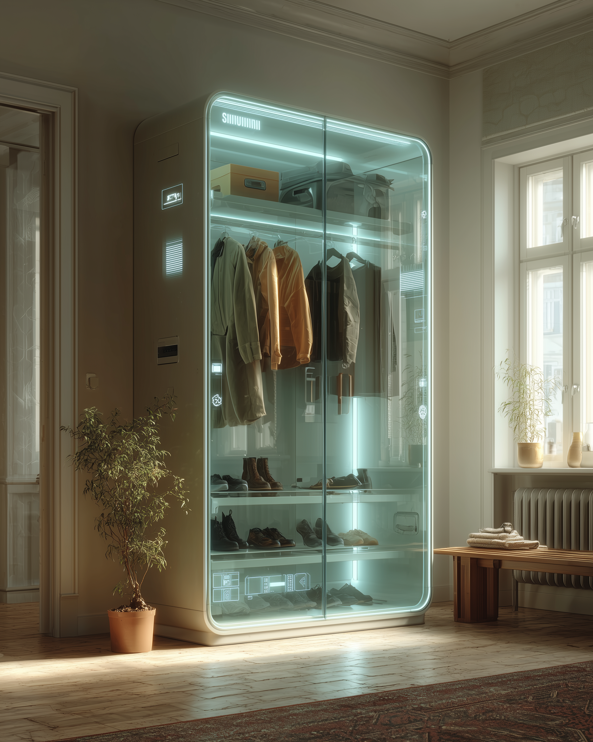 SmartWard — это концепт шкафа, который не просто хранит обувь и куртки, а ухаживает за ними: очищает, сушит, дезинфицирует и готовит к следующему выходу.
