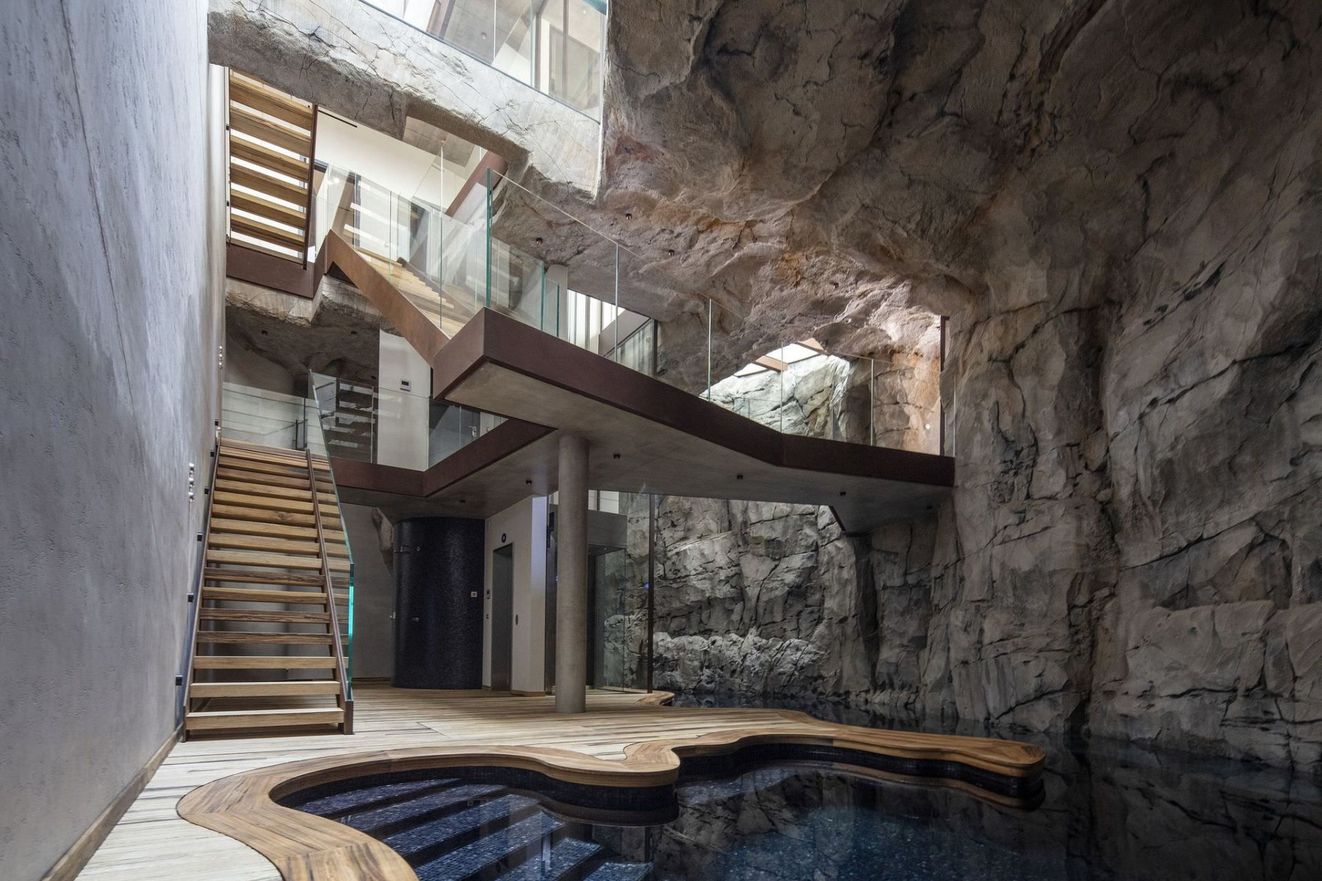 Площадь пятиэтажной виллы — около 500 м². Внутри — три спальни, три ванные комнаты, кухня и гостиная. Есть подземный бассейн, напоминающий природное озеро, хаммам, террасы, гараж и стеклянный лифт, который соединяет уровни.