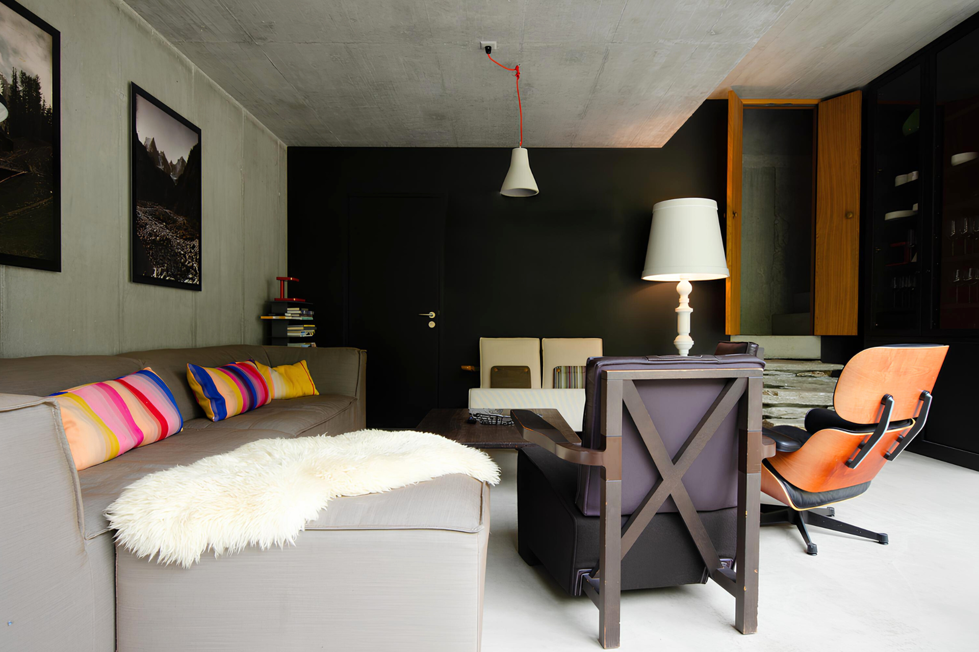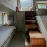 На первом этаже расположены кухня, гостиная и спальня с библиотекой. На втором — четыре компактные спальни, каждая со своей ванной. Сарай тоже используется: на его верхнем уровне есть спальное место для гостей — с кроватью из сена альпийских трав.